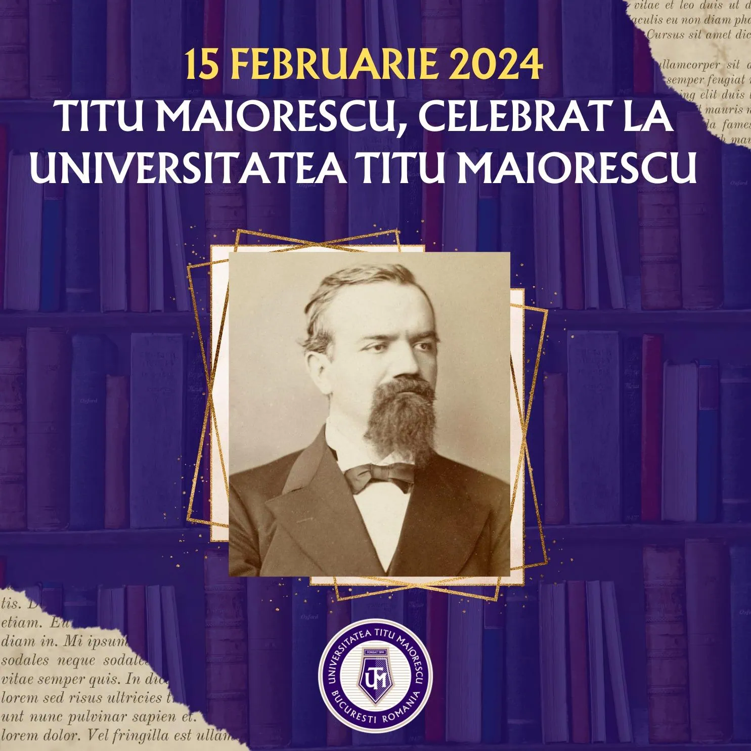 La 15 februarie, Universitatea Titu Maiorescu din București își celebrează mentorul și patronul spiritual, Titu Maiorescu, figură proeminentă a educației și culturii românești. Cu studii la Academia Theresianum, din Viena, la Universitatea din Berlin, la Universitatea din Giessen și la Sorbona, Titu Maiorescu a fost una dintre cele mai complexe personalități ale istoriei românești, care a contribuit în mod fundamental la crearea României Moderne. A fost jurist, profesor universitar, decan, rector, om politic, ministru și prim-ministru, președinte de partid, critic literar, scriitor, mentor cultural, academician. Fapt remarcabil, a fost cel mai tânăr rector, la numai 23 de ani, al Universității din Iași, prima universitate a țării, înființată în anul 1860. Ulterior, a fost și rectorul Universității din București, fondată în 1864. Titu Maiorescu rămâne în conștiința istoriei noastre, în primul rând, în calitatea sa de fondator al Societății „Junimea” și de critic literar, mentor al lui Eminescu și al generației marilor clasici ai literaturii române. Titu Maiorescu și-a dedicat întreaga viață dezvoltării naționale și modernizării societății românești prin educație și cultură, prin promovarea spiritului critic și a valorilor culturii europene în spațiul autohton, într-o țară aflată la începuturile unei noi epoci a existenței sale. Pentru Universitatea Titu Maiorescu, legatul maiorescian, asumat instituțional, afirmă importanța fundamentală a educației, științei și culturii în procesul dezvoltării, rolul lor de vectori ai progresului prin cunoaștere. În baza acestei viziuni, Universitatea își concepe întreaga activitate și dezvoltare sub auspiciile valorilor, meritului, calității și excelenței. În semn de omagiere a patronului său spiritual, ziua de 15 februarie consemnează și o vizită a reprezentanților Universității la mormântul lui Titu Maiorescu, de la Cimitirul Bellu.
