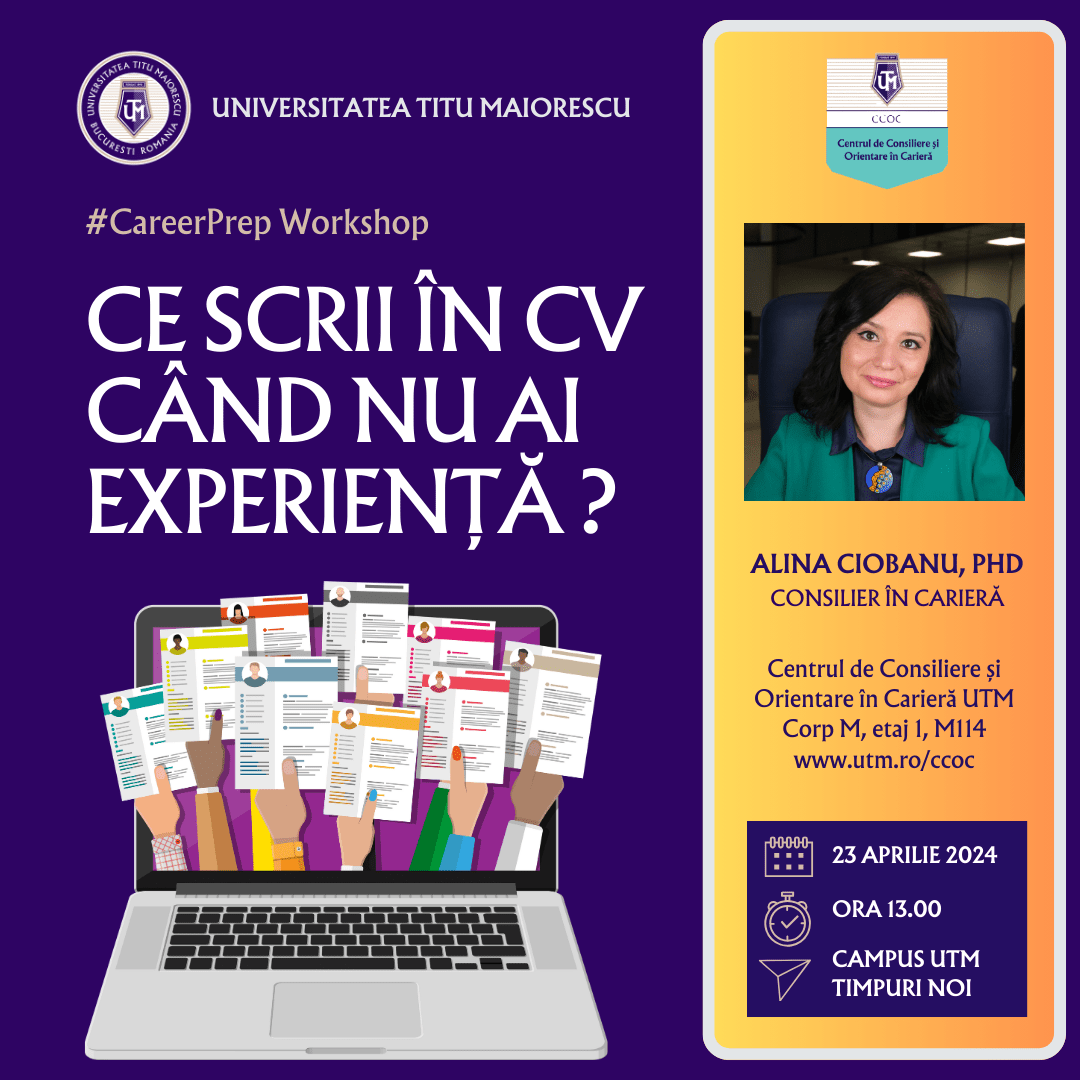 Centrul de Consiliere și Orientare al UTM organizează în data de 23 Aprile 2024, începând cu ora 13.00, workshopul #CareerPrep. Ce scrii în CV când nu ai experiență?