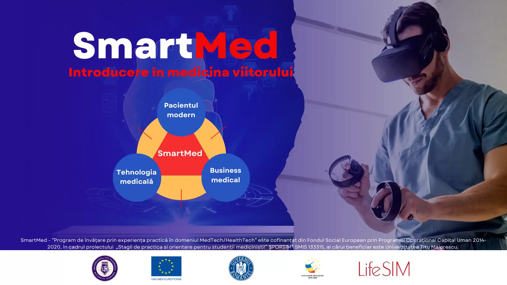 SmartMed este un Program de învățare prin experiență practică în domeniul MedTech/HealthTech, cofinanțat din Fondul Social European prin Programul Operațional Capital Uman 2014-2020, în cadrul proiectului „Stagii de practică și orientare pentru studenții mediciniști!” SPORSIM” SMIS 133315, al cărui beneficiar este Universitatea Titu Maiorescu.