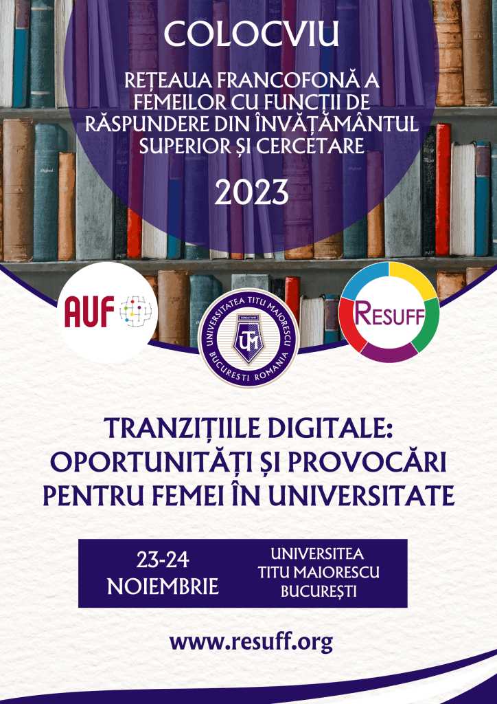 În zilele de 23 și 24 noiembrie 2023, RESUFF (Rețeaua francofonă a femeilor cu funcţii de răspundere din învățământul superior și cercetare) organizează un colocviu cu tema: „Tranziții digitale: oportunități și provocări pentru femei în universitate”, în colaborare cu Universitatea Titu Maiorescu din București și cu sprijinul Direcției Regionale pentru Europa Centrală și de Est a AUF.