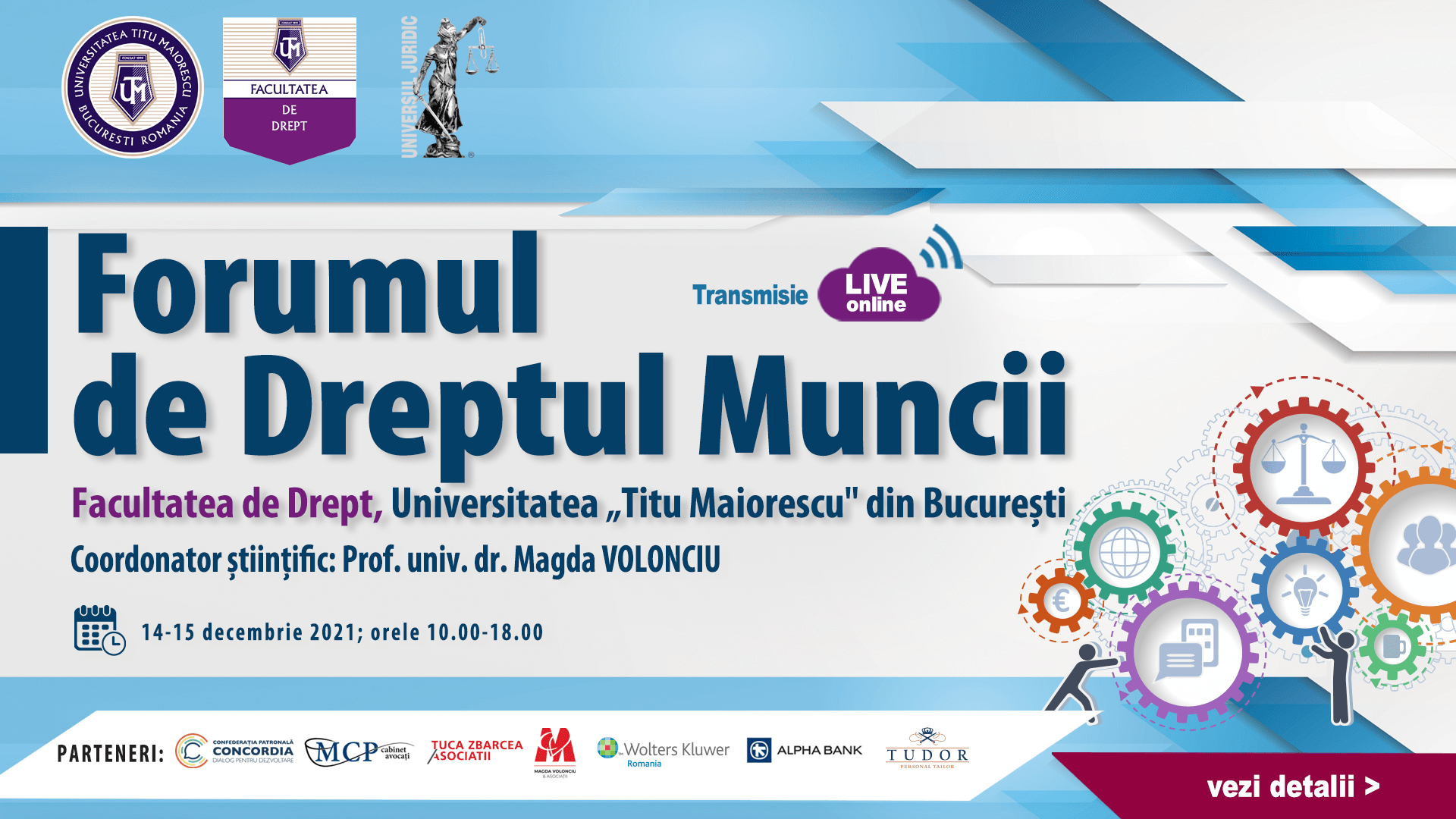 Universitatea „Titu Maiorescu” din București – Facultatea de Drept, în parteneriat cu Grupul editorial Universul Juridic, organizează, în perioada 14-15 decembrie 2021, între orele 10.00 – 18.00, Forumul de Dreptul Muncii – ediția I. În cadrul evenimentului, specialiști din domeniul dreptului muncii – teoreticieni și practicieni – vor dezbate cele mai acute, de actualitate și de impact probleme care apar în raporturile juridice de muncă.