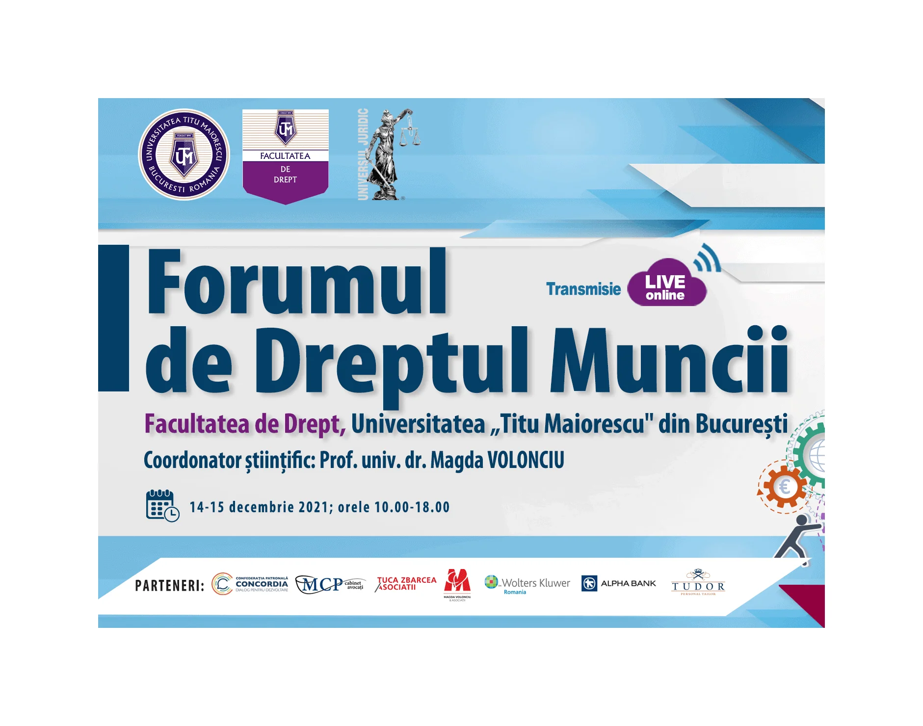 Universitatea „Titu Maiorescu” din București – Facultatea de Drept, în parteneriat cu Grupul editorial Universul Juridic, organizează, în perioada 14-15 decembrie 2021, între orele 10.00 – 18.00, Forumul de Dreptul Muncii – ediția I. În cadrul evenimentului, specialiști din domeniul dreptului muncii – teoreticieni și practicieni – vor dezbate cele mai acute, de actualitate și de impact probleme care apar în raporturile juridice de muncă.