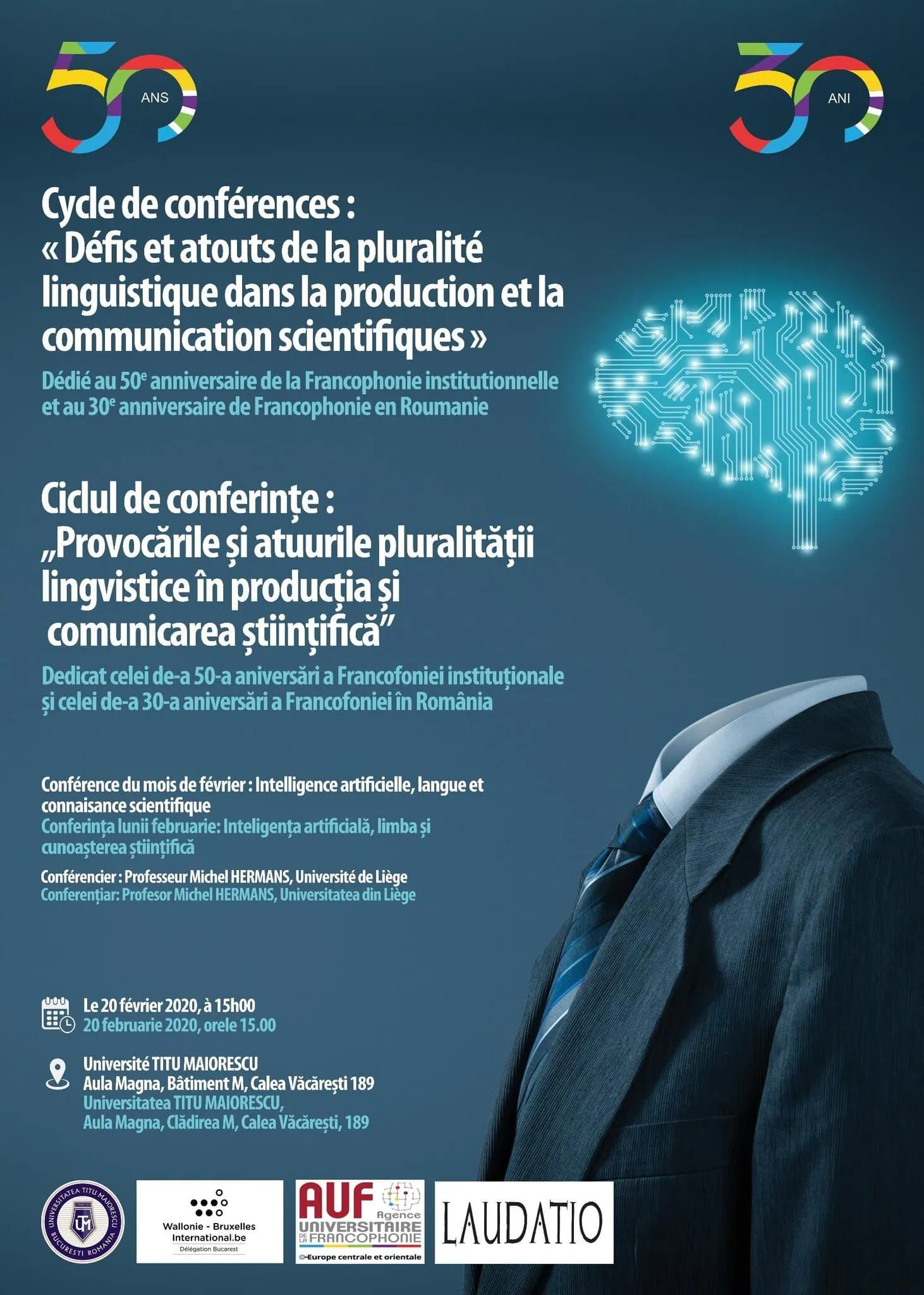 Această conferință face parte din ciclul „Provocări și atuuri ale pluralității lingvistice în producția și comunicarea științifică„, inițiat de Centrul francofon al Universității „Titu Maiorescu”, în cadrul evenimentelor dedicate Francofoniei. Anul 2020 marchează a 50-a aniversare a Francofoniei instituționale și a 30-a aniversare a Francofoniei în Romania.