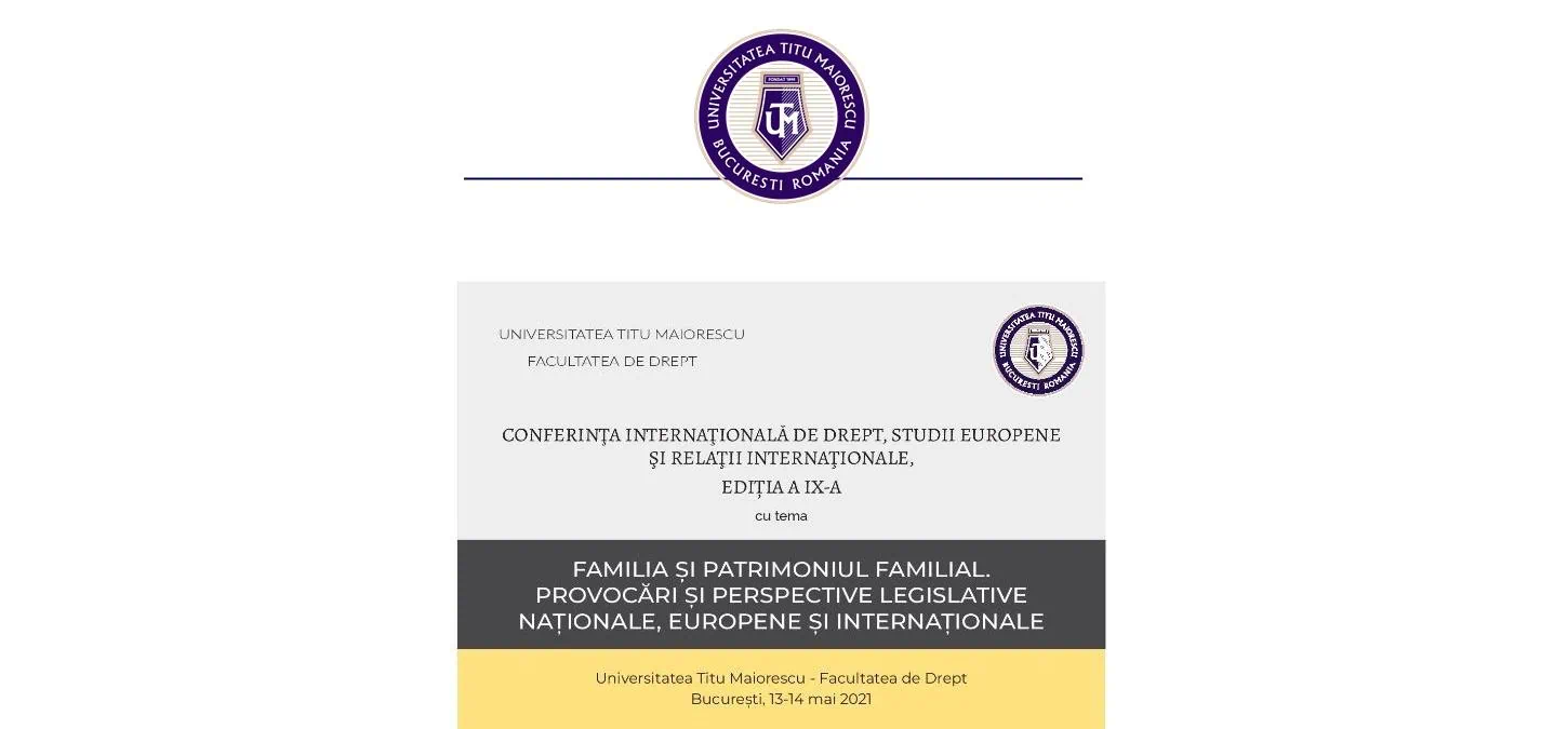 În contextul actual existent la nivel național și internațional, Facultatea de Drept a Universității Titu Maiorescu vă aduce la cunoștință că ediția a IX-a a Conferinței Internaționale de Drept, Studii Europene și Relații Internaționale se va organiza în data de 13-14 mai 2021 prin mijloace de comunicare care să asigure respectarea normelor pandemice pentru toți participanții.