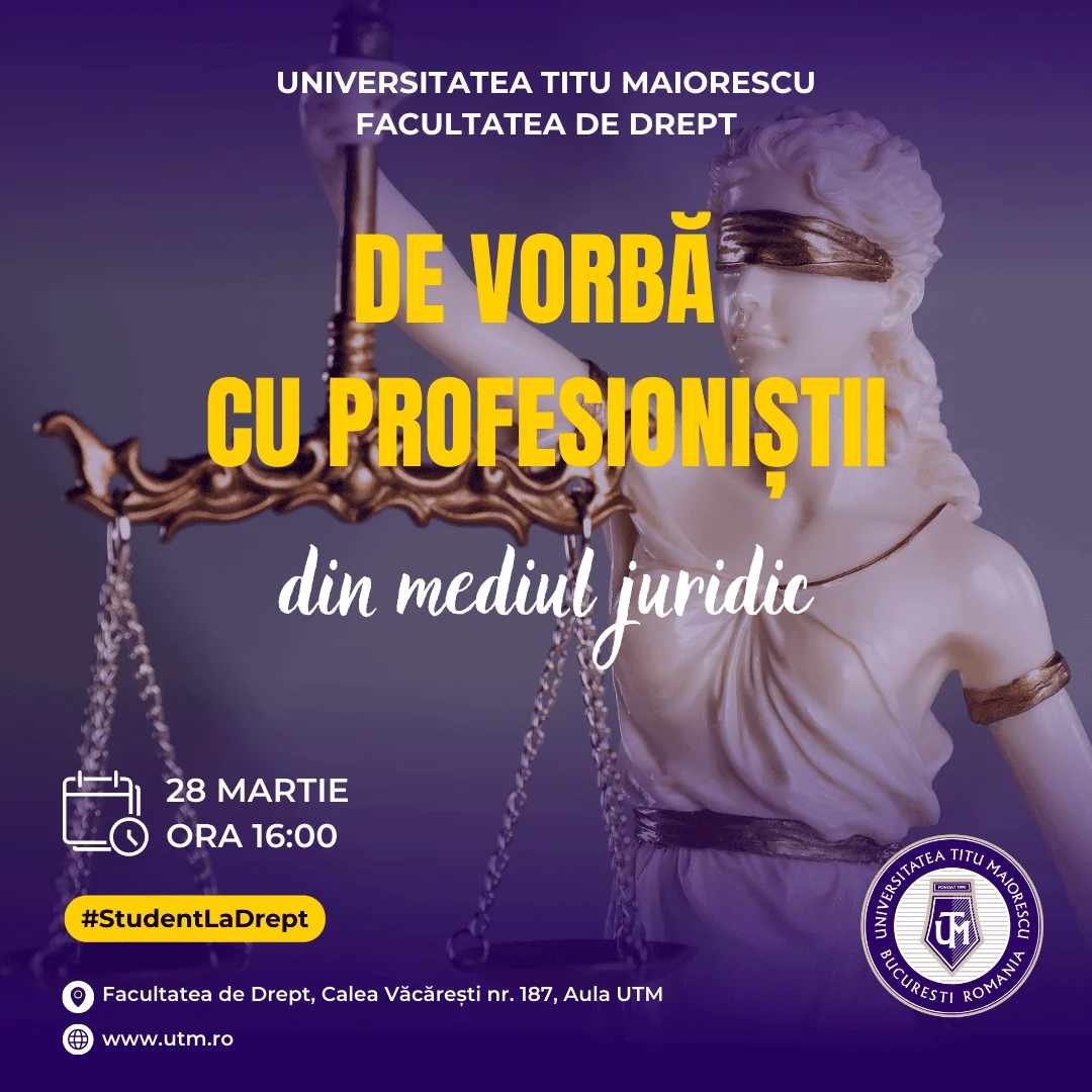 În data de 28 martie 2023, ora 16.00, va avea loc întâlnirea studenților maiorescieni din cadrul Facultății de Drept UTM cu profesioniști din domeniul juridic (Calea Văcărești nr. 187, Corp V, Aula UTM ).