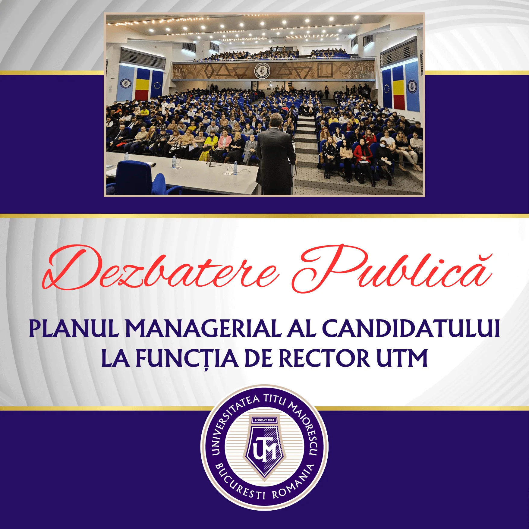 Miercuri, 20 martie 2024 a avut loc dezbaterea publică a Programului Managerial al Candidatului la funcția de Rector cu întreaga comunitatea academică UTM, în baza Metodologiei privind procesul de constituire și de alegere a structurilor și funcțiilor de conducere din Universitatea Titu Maiorescu pentru perioada 2024-2029, conform anexei 1 – Calendarul constituirii și alegerii structurilor și funcțiilor de conducere din UTM, 2024-2029.