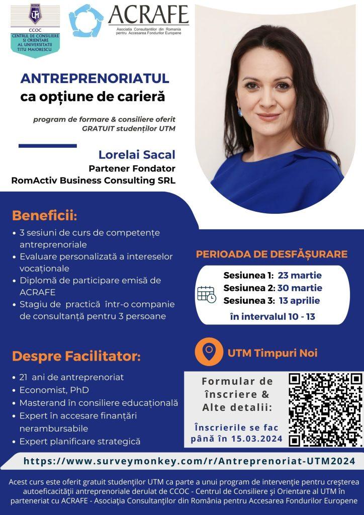 Centrul de Consiliere și Orientare al UTM în parteneriat cu ACRAFE – Asociația Consultanților din România pentru Accesarea Fondurilor Europene vă invită să participați la programul ”Antreprenoriatul, ca opțiune de carieră”, program de dezvoltare a competențelor și autoeficacității antreprenoriale!