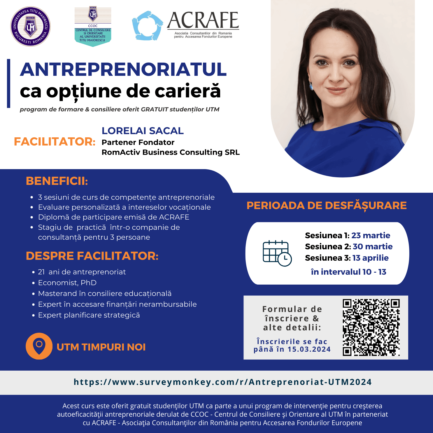 - Participare pe bază de înscriere accesând formularul aici: https://www.surveymonkey.com/r/Antreprenoriat-UTM2024. Spots are limited!
