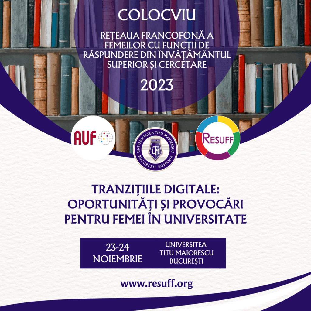 În zilele de 23 și 24 noiembrie 2023, RESUFF (Rețeaua francofonă a femeilor cu funcţii de răspundere din învățământul superior și cercetare) organizează un colocviu cu tema: „Tranziții digitale: oportunități și provocări pentru femei în universitate”, in colaborare cu Titu Maiorescu University din București și cu sprijinul Direcției Regionale pentru Europa Centrală și de Est a AUF.