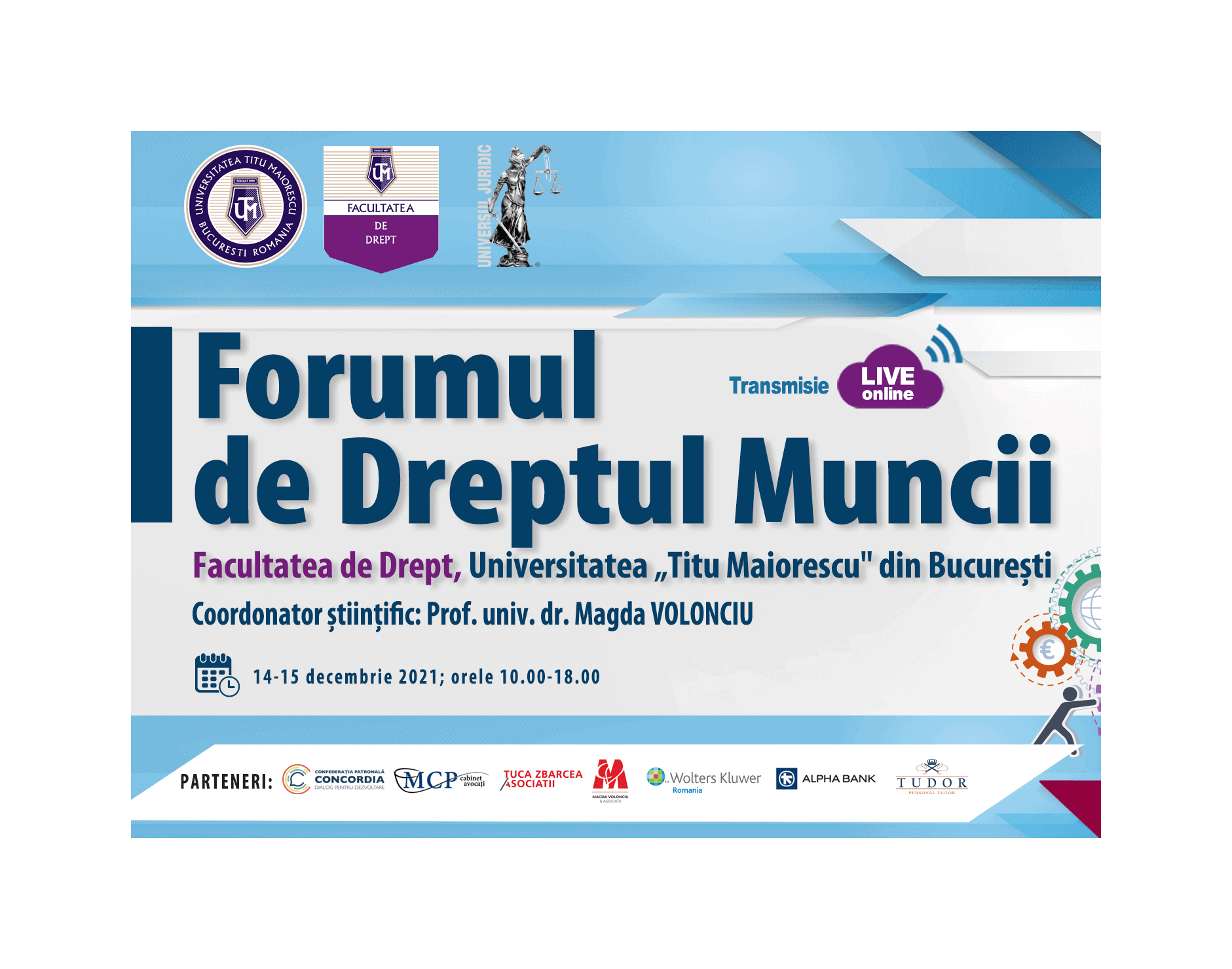 Universitatea „Titu Maiorescu” din București – Facultatea de Drept, in partnership with Grupul editorial Universul Juridic, organizează, în perioada 14-15 decembrie 2021, între orele 10.00 – 18.00, Forumul de Dreptul Muncii – ediția I. În cadrul evenimentului, specialiști din domeniul dreptului muncii – teoreticieni și practicieni – vor dezbate cele mai acute, de actualitate și de impact probleme care apar în raporturile juridice de muncă.
