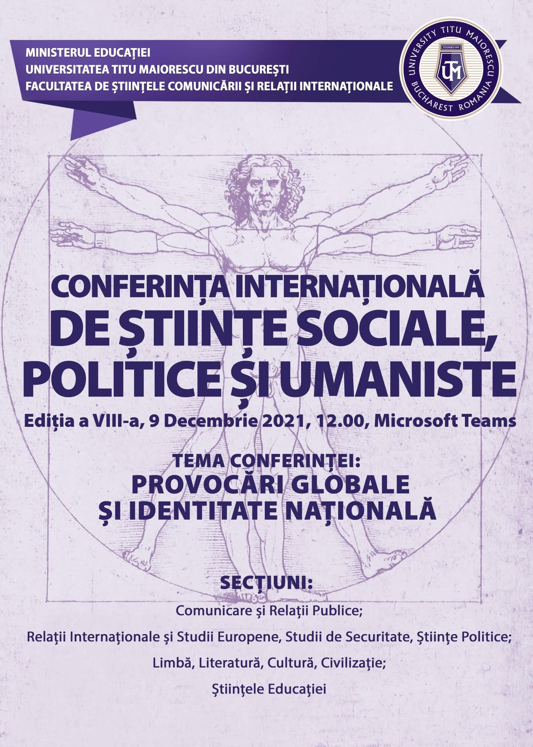 Faculty of Communication Sciences and International Relations a Universității Titu Maiorescu din București organizează Conferința Internațională de Științe Sociale, Politice și Umaniste, ediția a VIII-a, manifestare științifică de anvergură, care acoperă domenii fundamentale ale educației și cercetării. Evenimentul se va desfășura în format online (platforma Microsoft Teams) în data de 9 decembrie 2021, începând cu ora 12.00, sub genericul: Provocări globale și identitate națională.