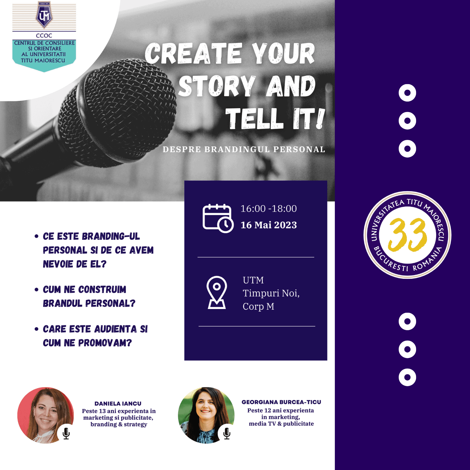 În cadrul evenimentelor organizate cu prilejul împlinirii a 33 de ani de la înființarea Universității Titu Maiorescu București și a Zilelor Carierei, Centrul de Consliere și Orientare în Carieră al Universității Titu Maiorescu invită studenții maiorescieni la workshop-ul „Create Your Story and Tell It!” – despre Branding-ul Personal.