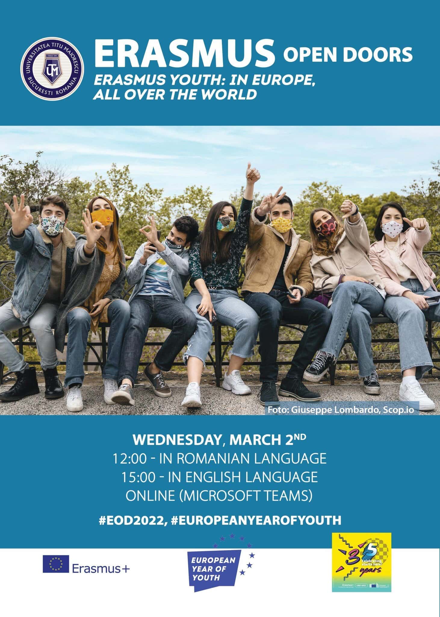 Pentru familiarizarea studenților cu modul de desfasurare a programului Erasmus+, Departamentul Relaţii Internaţionale al UTM vă invită miercuri, 02 martie 2022, la evenimentul online Erasmus Open Doors at Titu Maiorescu University.