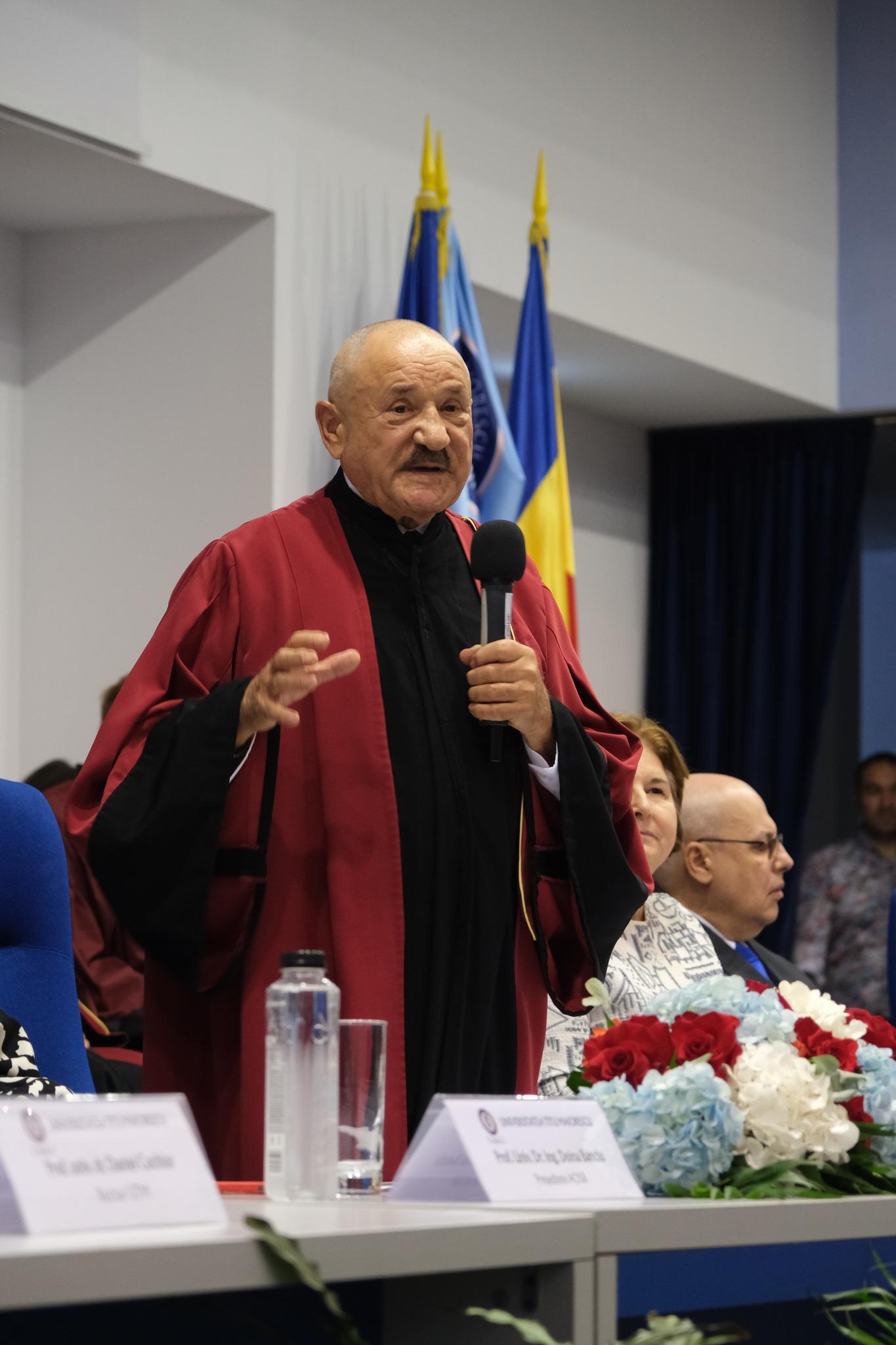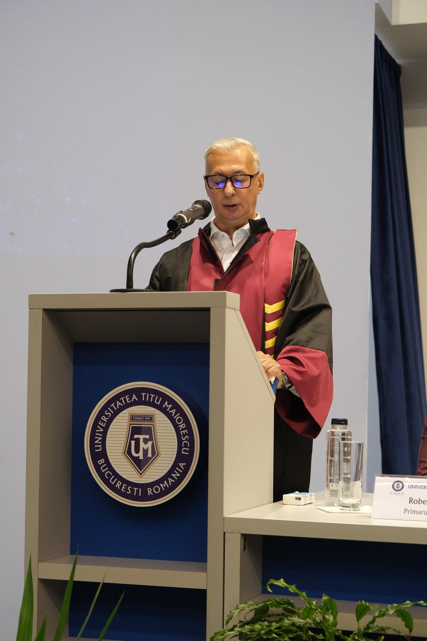 The presidium included university management faculty as well as guests from outside the institution: Univ. Prof. Dr. Iosif R. Urs (President of the University), Univ. Prof. Dr. Daniel Cochior (Rector of the University), Univ. Prof. Dr. Valentin Pau (Vice-President of the Administrative Council), Univ. Prof. Dr. Smaranda Angheni (Vice-President of the Administrative Council), Assoc. Prof. Dr. Iustin Priescu (President of the University Senate), Univ. Prof. Dr. Titi Paraschiv (Vice-Rector for Scientific Research), Assoc. Prof. Dr. Elena Rusu (Vice-Rector for Education), Assoc. Prof. Dr. Geanina Banu (Vice-Rector for International Relations), Univ. Prof. Dr. Alexandru Vlad Ciurea (Honorary Member of the Romanian Academy, Scientific Director of Sanador Clinical Hospital), who presented the paper titled „Per Aspera ad Astra”.