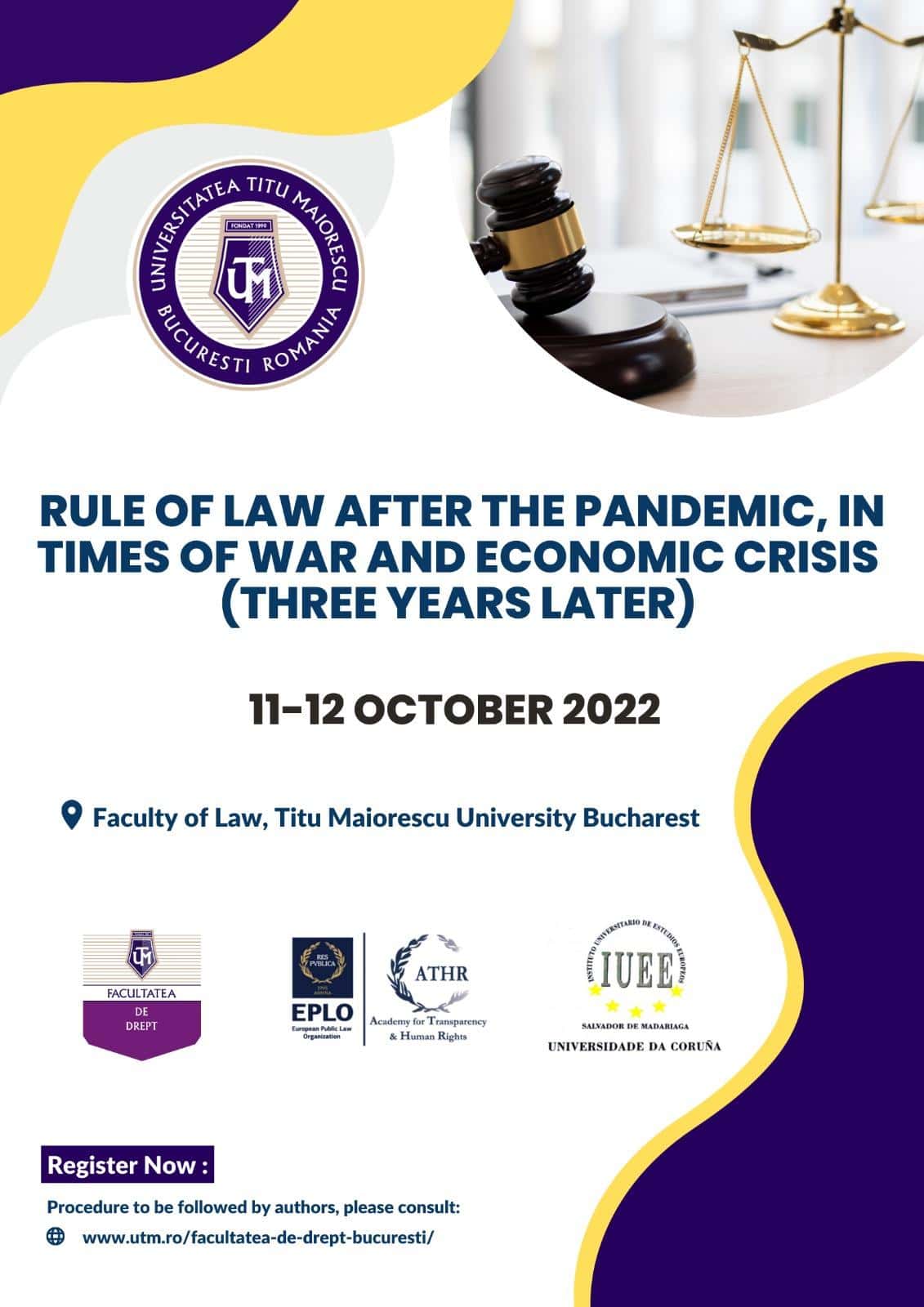 Facultatea de Drept de la Universitatea Titu Maiorescu împreună cu Organizația Europeană de Drept Public și Institutul Universitar de Studii Europene „Salvador de Madariaga” – Universitatea din A Coruña , organizează cea de-a doua ediție a conferinței International Conference on Rule Of Law între 11-12 Octombrie 2022 în București, la adresa: Calea Văcărești, numărul 189, corp V, etaj 3, Amfiteatru 302.