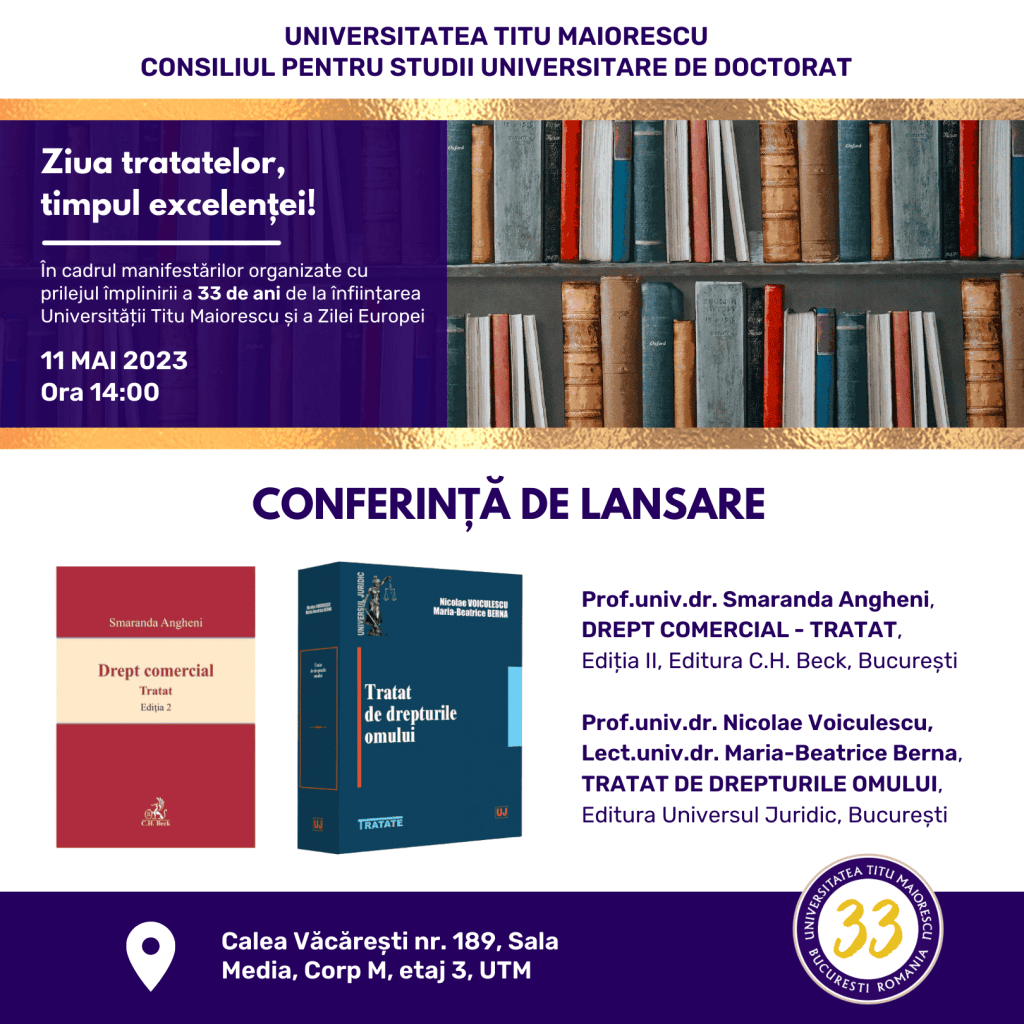 În cadrul manifestărilor organizate cu prilejul împlinirii a 33 de ani de la înființarea Universității Titu Maiorescu București și a Zilei Europei, avem plăcerea să vă invităm să participați joi, 11 mai, ora 14:00 la Conferința „Ziua Tratatelor, Timpul Excelenței!”