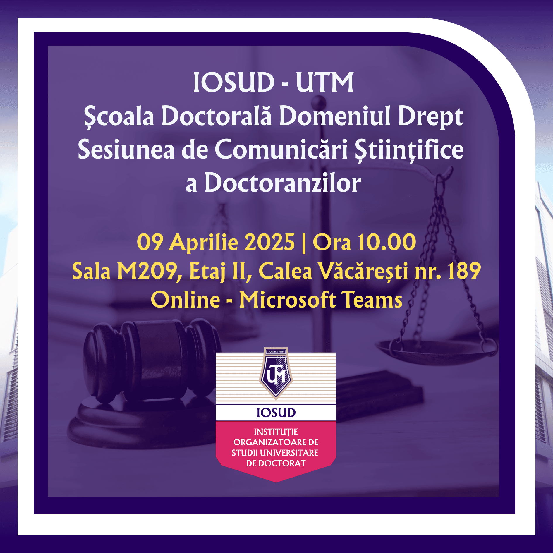 Sesiunea de comunicări științifice a doctoranzilor Școlii doctorale domeniul Drept,  va avea loc în data de  09 aprilie 2025 ora 10.00,  în sala M209, etaj II, Calea Văcărești 189, sector 4, București  și online pe platforma Microsoft Teams.