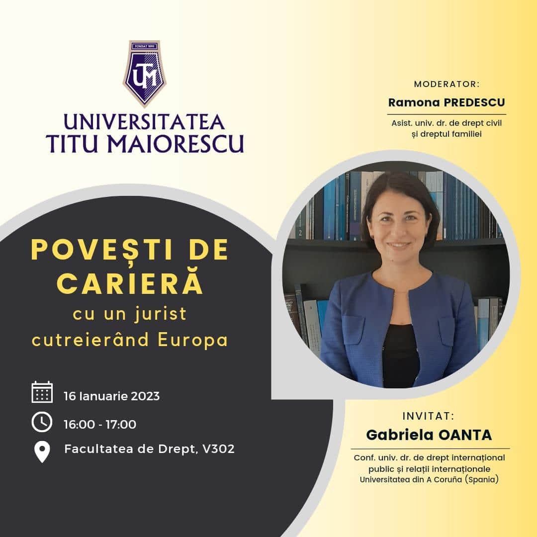 Faculty of Law within Titu Maiorescu University organizează în data de 16 ianuarie 2022, orele 16:00-17:00, cu sprijinul Asist. univ. dr. Ramona PREDESCU evenimentul intitulat „Povești de carieră cu un jurist cutreierând Europa”.