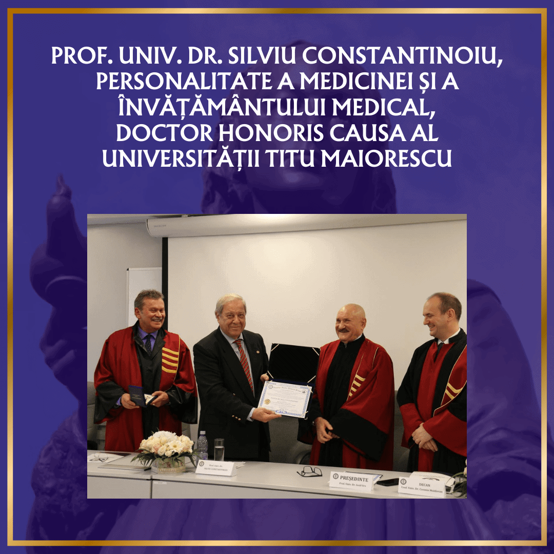 În data de 26 noiembrie, Universitatea Titu Maiorescu din București a decernat titlul de DOCTOR HONORIS CAUSA D-lui PROF. UNIV. DR. SILVIU CONSTANTINOIU (Universitatea de Medicină și Farmacie „Carol Davila”), personalitate a medicinei și a învățământului medical românesc. Evenimentul a avut loc în cadrul Facultății de Medicină (Amfiteatru, etajul 1, Clădirea IOR 2), în prezența unui public select format din membri ai corpului academic, cadre didactice universitare, cercetători științifici, medici de marcă, studenți, rezidenți și doctoranzi.