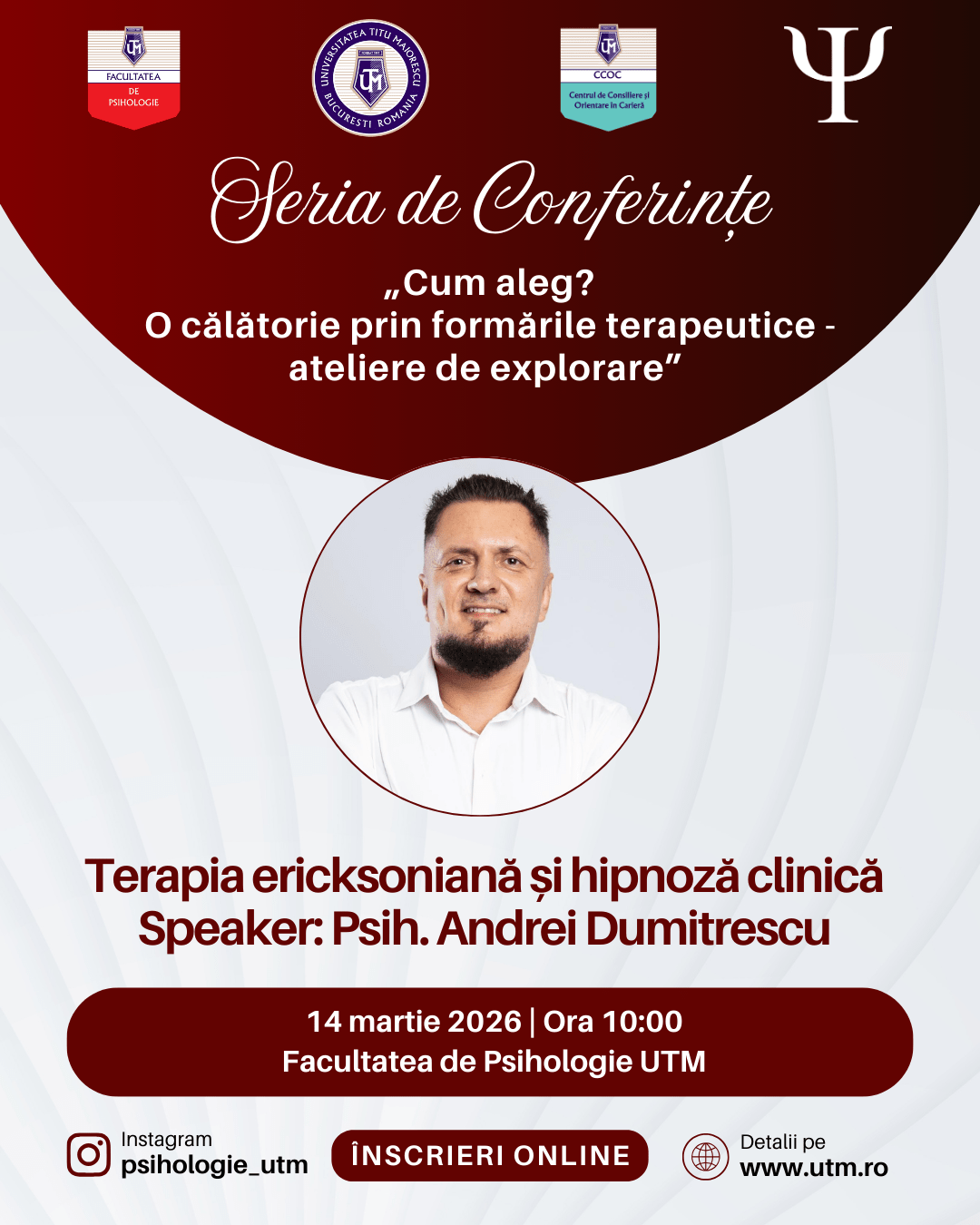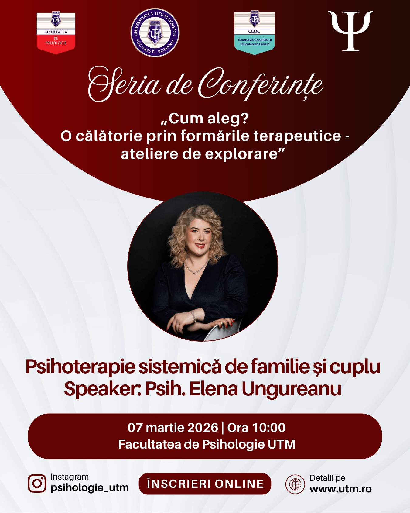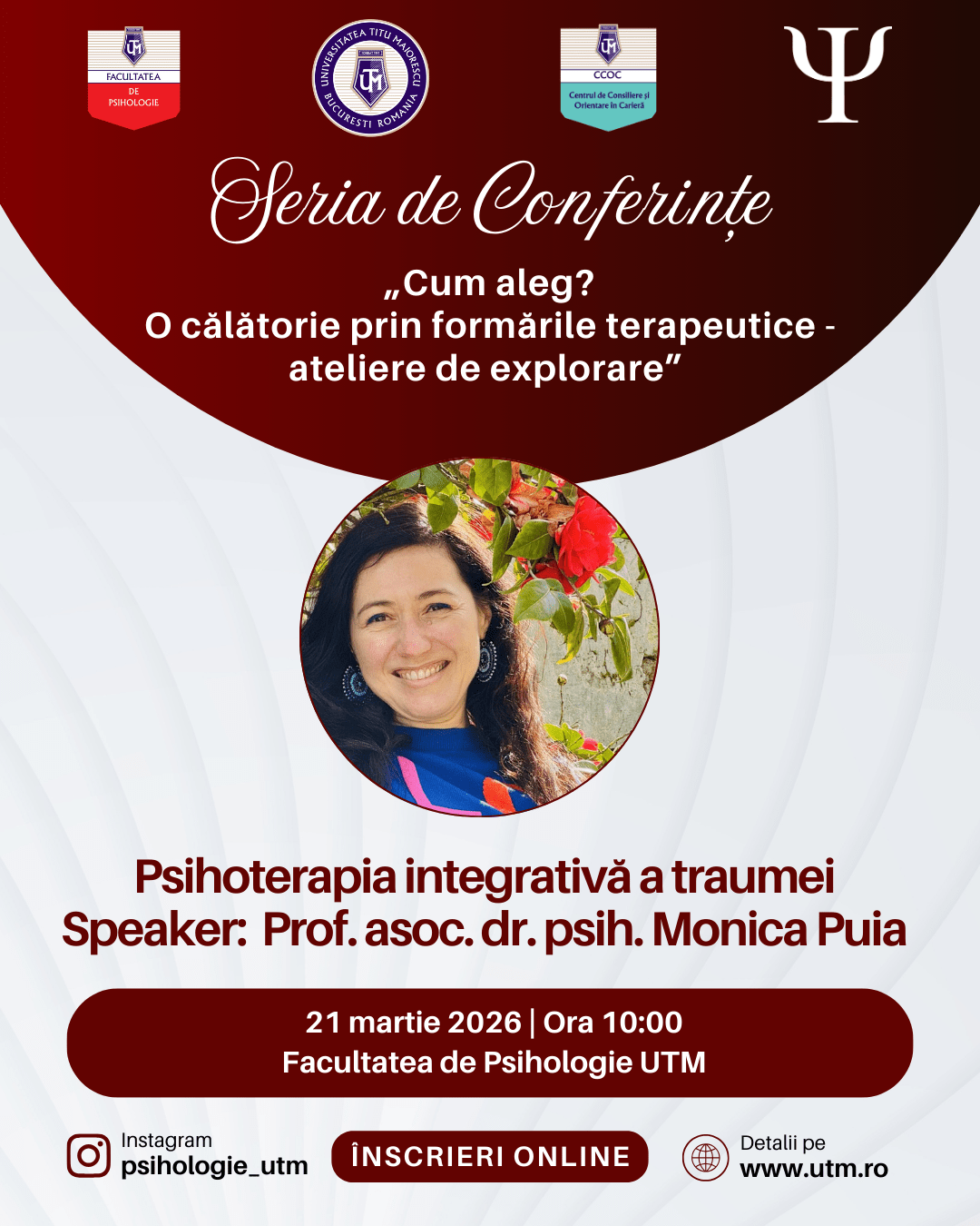 Faculty of Psychology din cadrul Universității „Titu Maiorescu” din București, în parteneriat cu Center for Counseling and Career Guidance (CCCG), organizează seria de conferințe și ateliere exploratorii „Cum aleg? O călătorie prin formările terapeutice – ateliere de explorare”, un proiect dedicat studenților care își doresc claritate și repere solide în alegerea direcției lor profesionale în domeniul psihoterapiei. Proiectul este inițiat și coordonat de studentele Ramona Manolache, Ileana Anca Baiciu and Bianca Baciu și își propune să creeze un cadru autentic de întâlnire între viitorii psihologi și formatori consacrați din principalele orientări terapeutice.