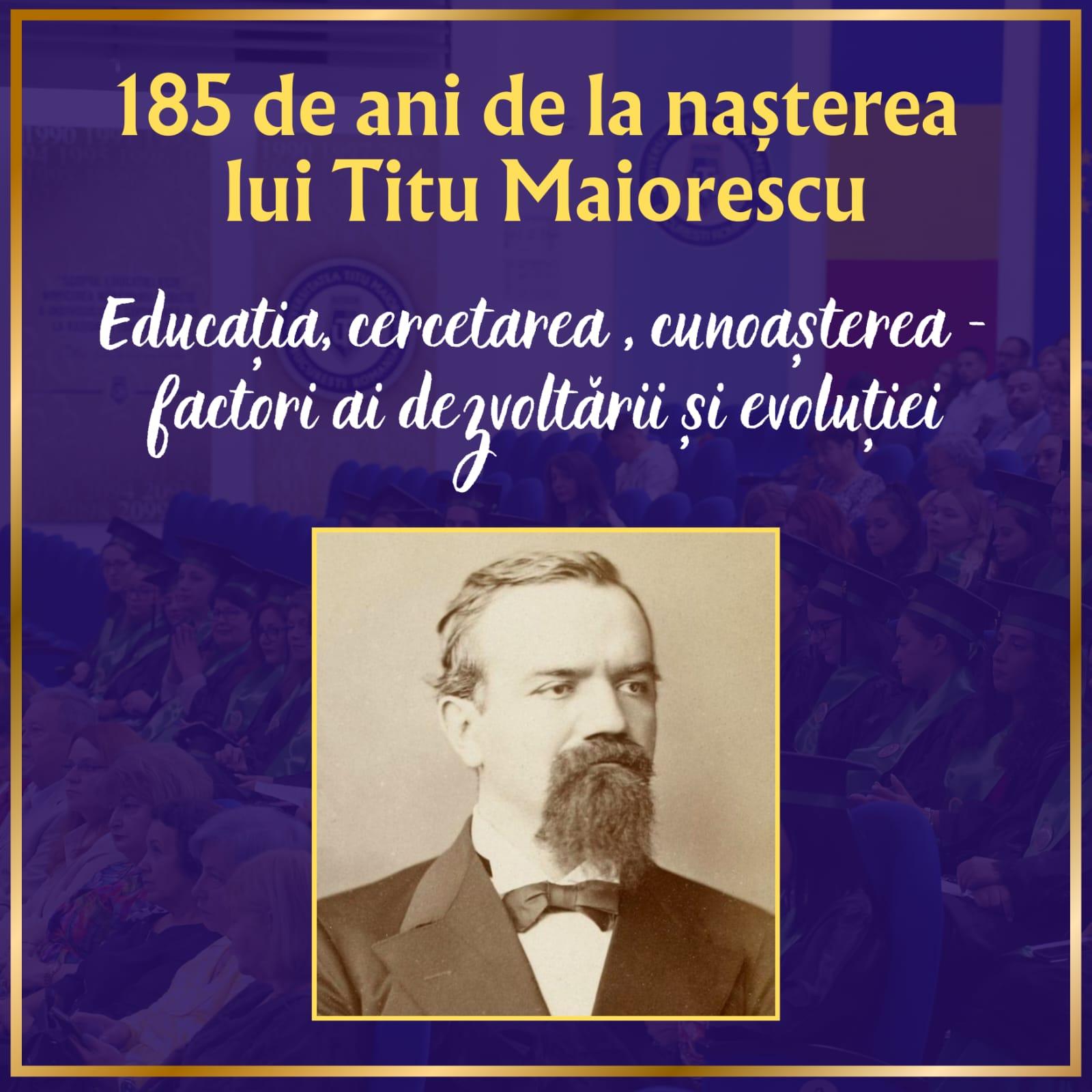 La împlinirea a 185 de ani de la nașterea lui Titu Maiorescu, Titu Maiorescu University of Bucharest își omagiază mentorul și patronul spiritual, își reafirmă misiunea de a educa și forma tinerele generații la cele mai înalte standarde și angajamentul pentru educație și cercetare de calitate. La împlinirea a 35 de ani de existență, pe 23 aprilie 2025, Universitatea care poartă, programatic, numele lui Titu Maiorescu este o instituție de învățământ superior complexă și comprehensivă, care reunește în structura sa o largă diversitate de programe academice clasice și moderne, la nivel de licență, masterat, doctorat și studii postuniversitare. Construită pe fundamentul universității europene, deschisă spre nou, digitalizare, inovare și avangardă, conectată la evoluțiile științei și culturii în Era Cunoașterii și Inteligenței Artificiale, Universitatea Titu Maiorescu este una dintre universitățile de calitate ale României, recunoscută ca atare la nivel național și internațional. Un argument incontestabil al statutului și calității Universității Titu Maiorescu îl constituie prezența sa în Metaranking-urile realizate la nivel național, între primele 30 de universități ale țării, unica universitate particulară inclusă în aceste prestigioase clasamente.