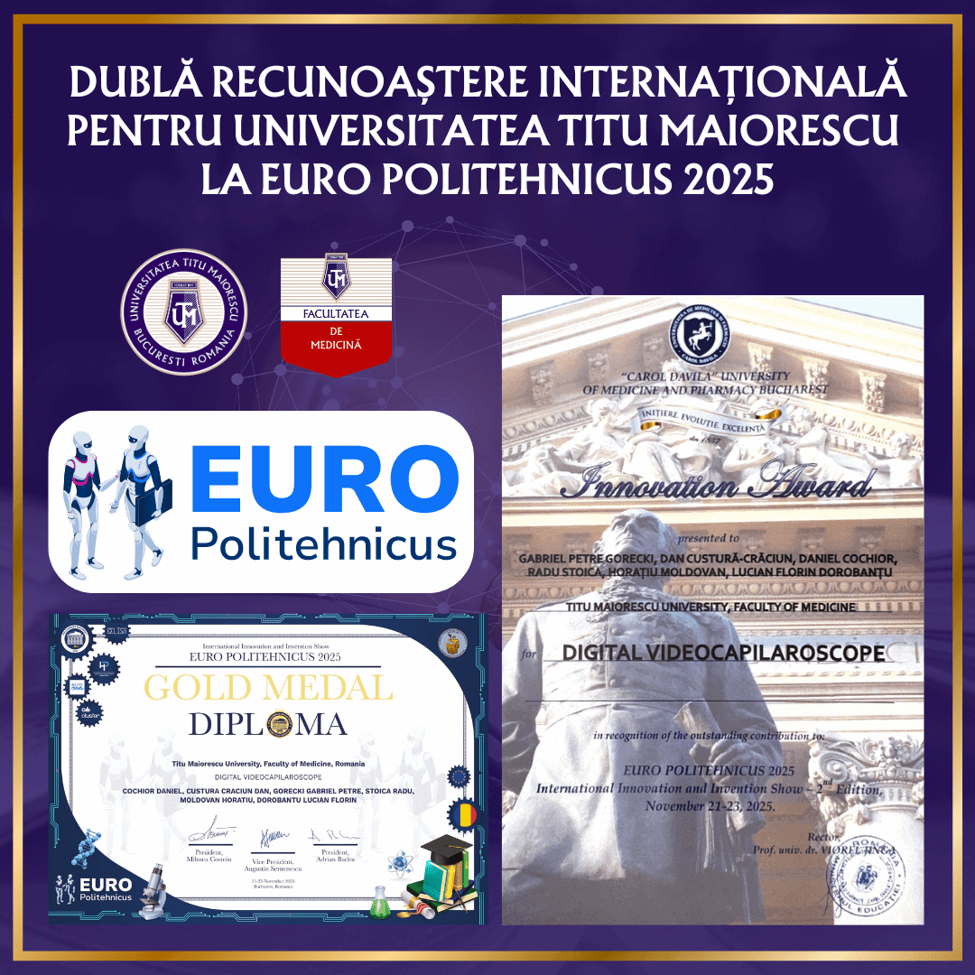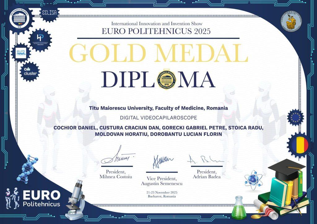 Titu Maiorescu University, prin Faculty of Medicine, a obținut la Salonul Internațional de Inovare și Invenții EURO POLITEHNICUS 2025 două distincții importante to Proiectul „Digital Videocapilaroscope”: Medalia de Aur, decernată de organizatori, și Innovation Award, titlu oferit de Universitatea de Medicină și Farmacie „Carol Davila” din București, for contribuția remarcabilă adusă în domeniu.