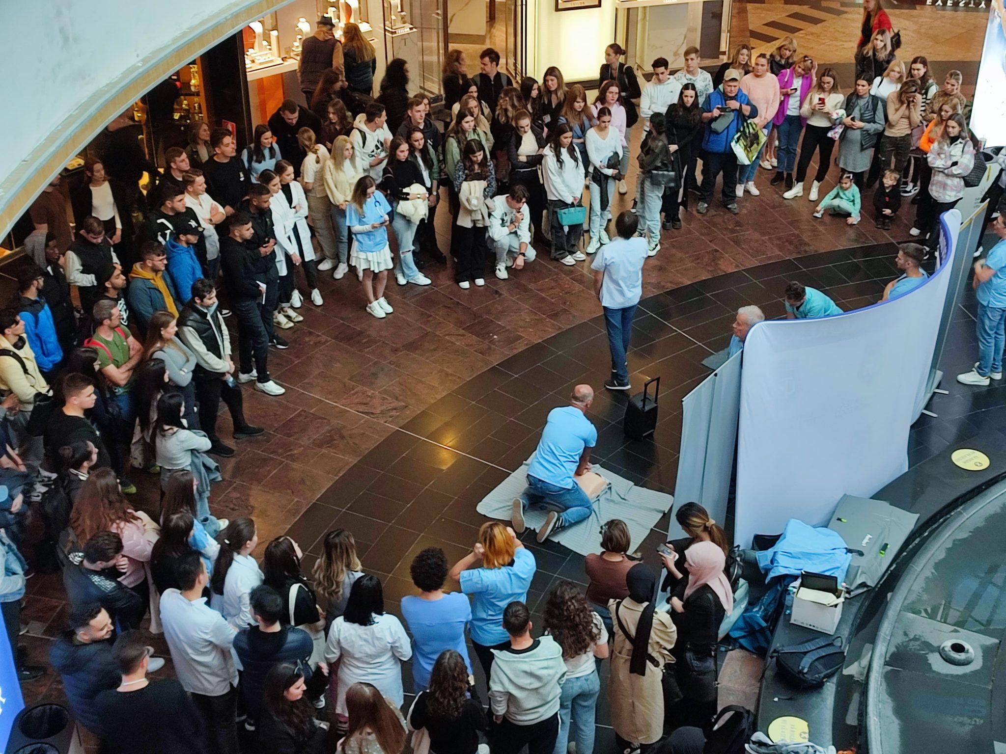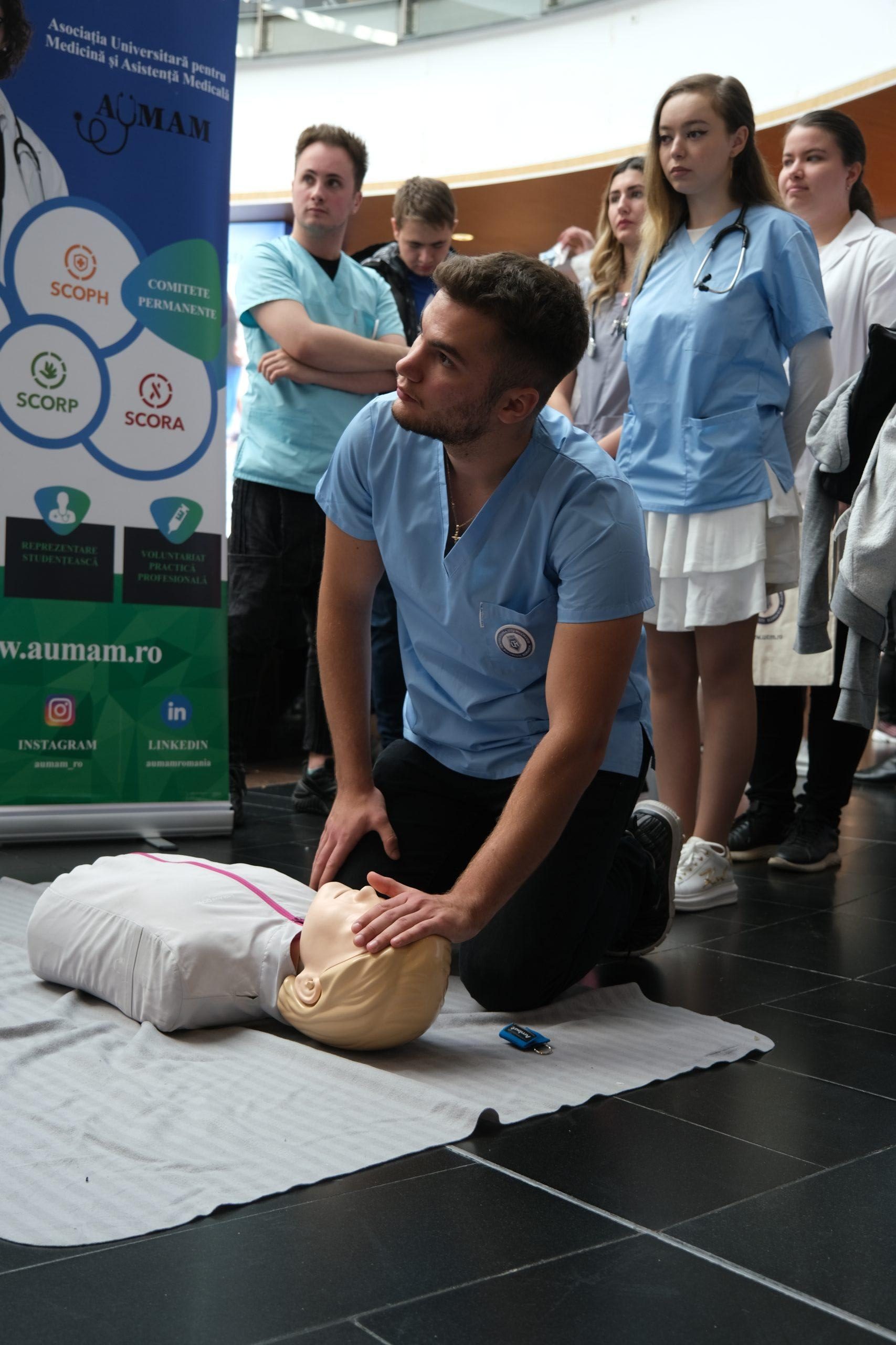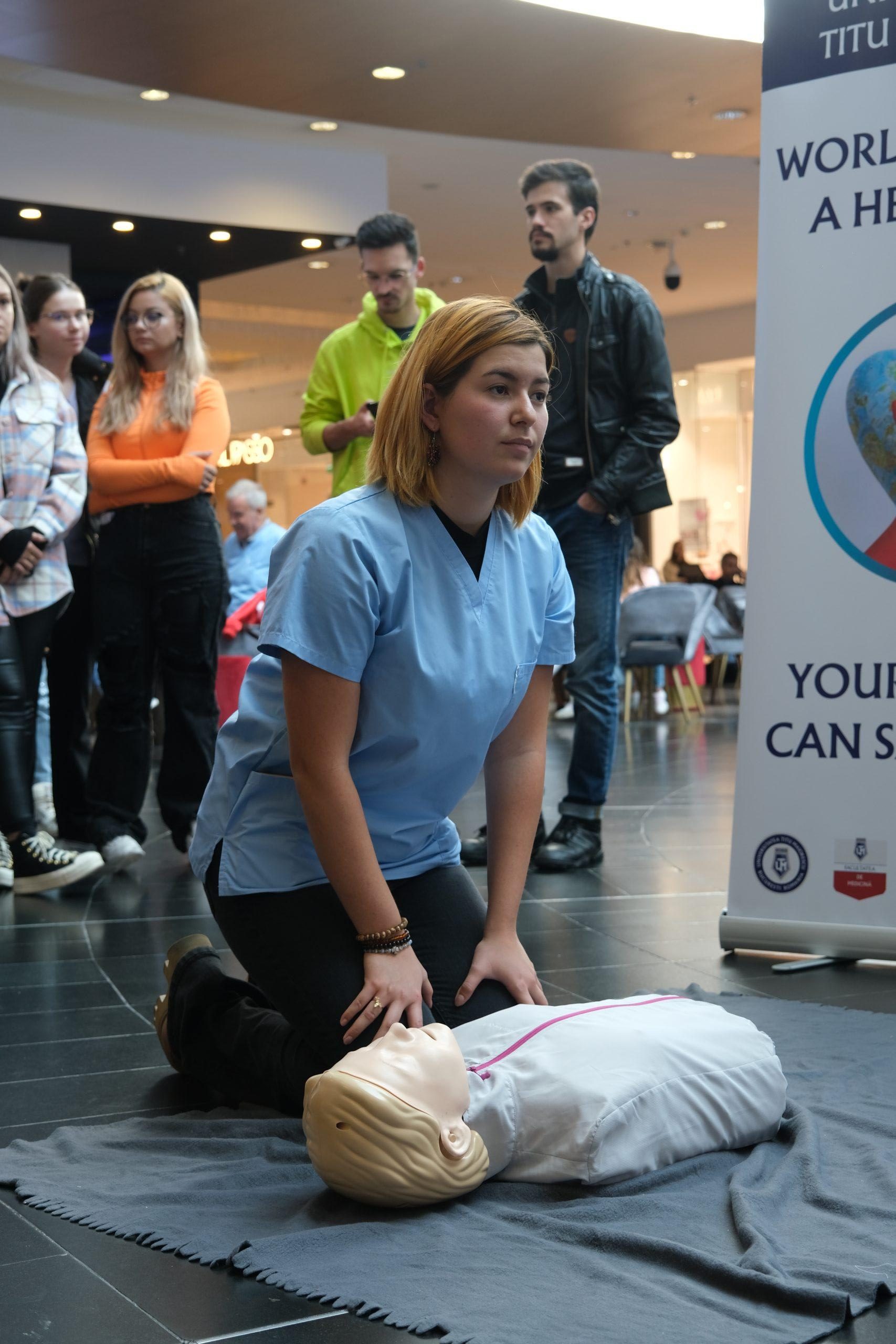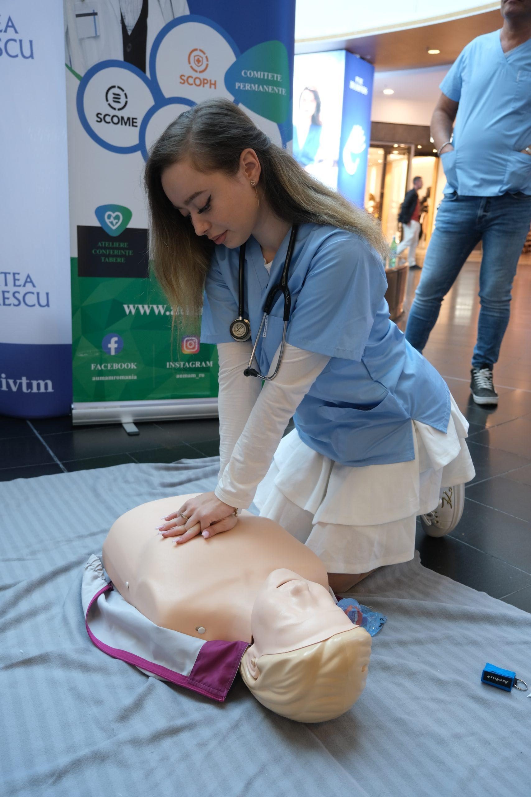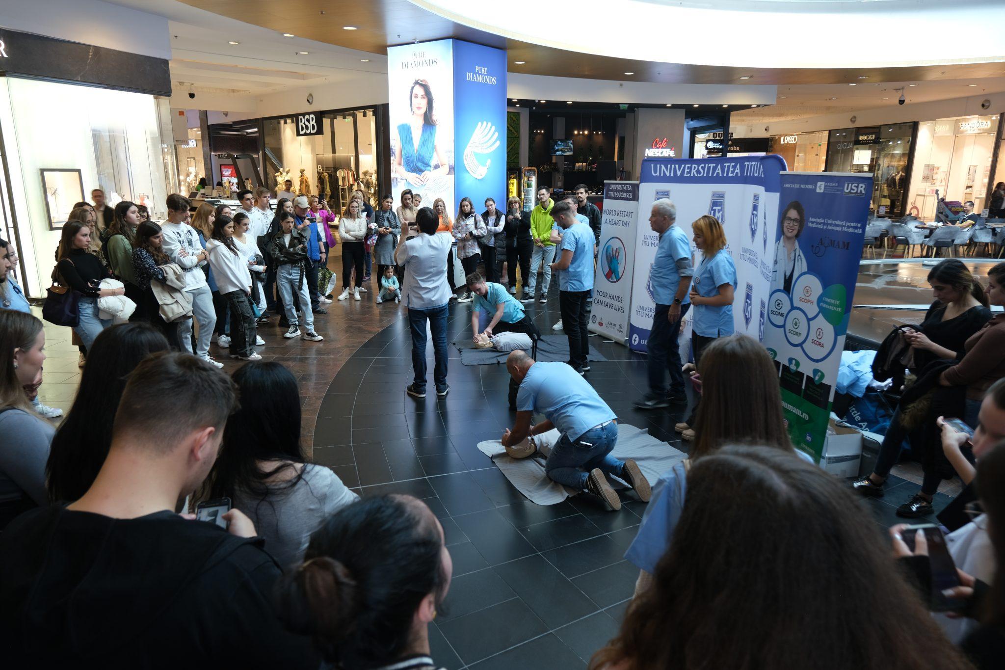 Faculty of Medicine at Titu Maiorescu University from Bucharest yesterday marked World Restart a Heart Day through free first aid and Basic Life Support (BLS) workshops. The event took place in Băneasa Shopping City and enjoyed the large presence of teachers, students, and visitors from the mall, located in the north of the capital. Participants had the opportunity to learn life-saving maneuvers, applying theory on state-of-the-art first aid mannequins under the careful guidance of teachers and medical students from Maiorești.