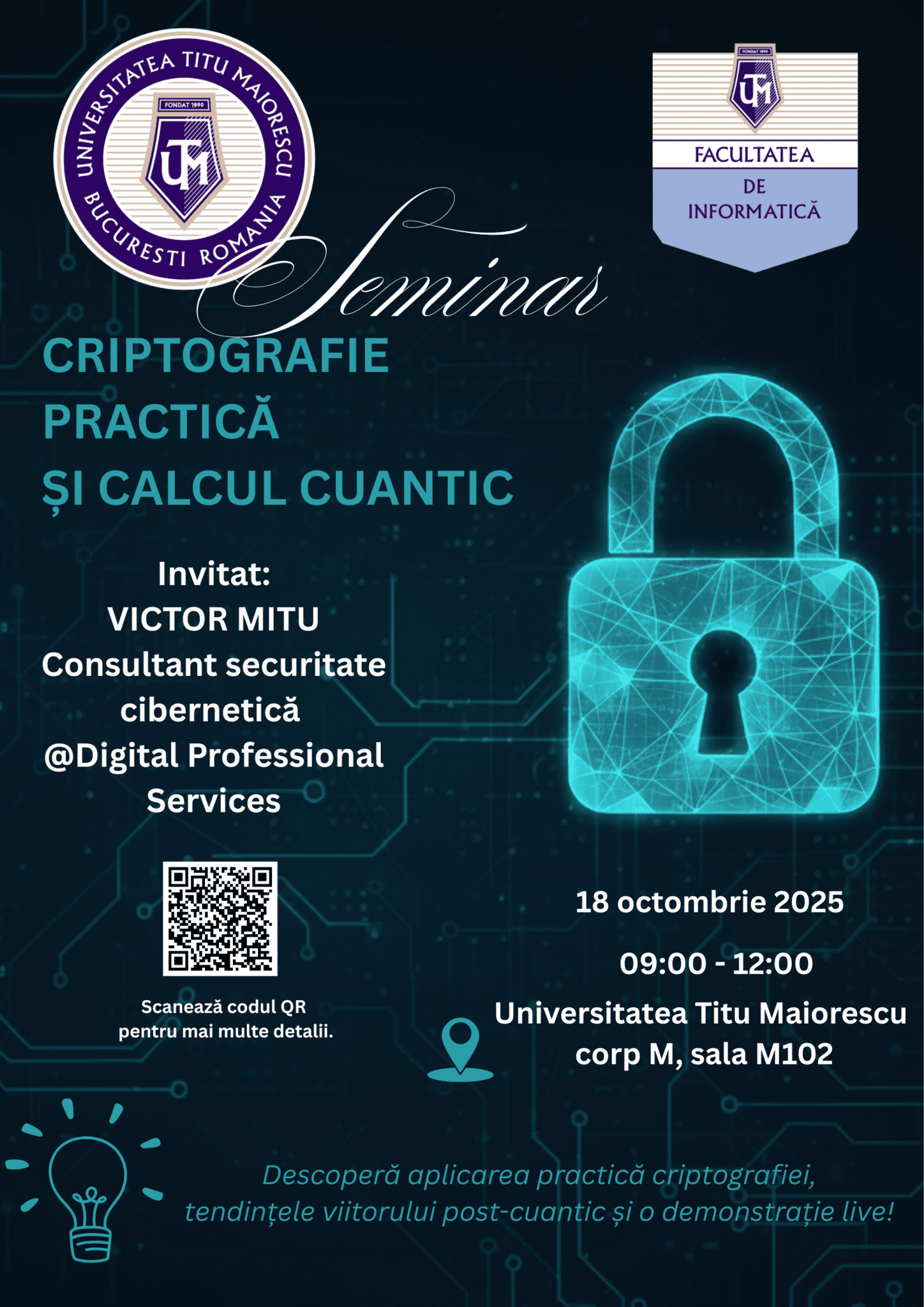 Seminarul își propune să ofere participanților ocazia de a descoperi utilizarea efectivă a criptografiei în cadrul organizațiilor și controalele de securitate pe care aceasta le oferă sau pentru care oferă suport. Subiectele abordate includ aspecte esențiale legate de protejarea criptografiei în sine și bunele practici privind operarea unei infrastructuri de chei publice (Public Key Infrastructure – PKI). Pentru a contura o imagine completă, sesiunea abordează și tendințele și viitorul criptografiei în lumea post-cuantică. Este inclusă și o demonstrație practică.