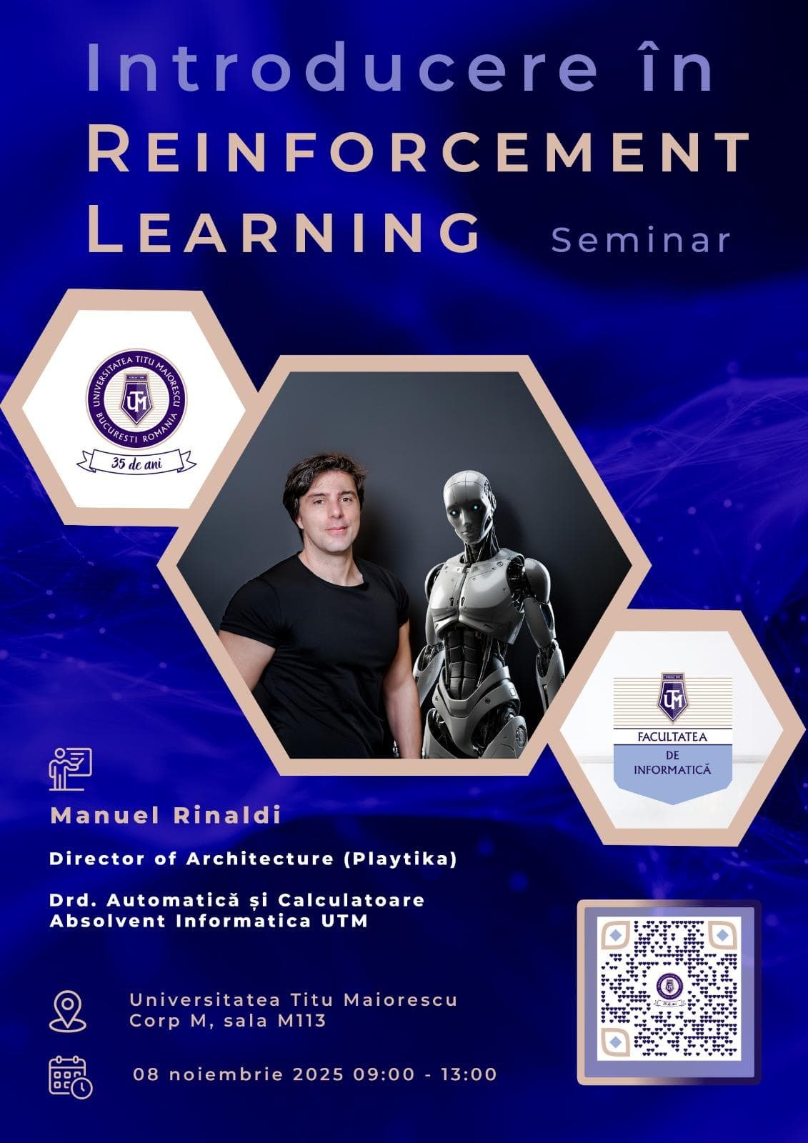 Evenimentul este deschis studenților și pasionaților de inteligență artificială care doresc să înțeleagă cum pot mașinile să învețe să ia decizii din ce în ce mai bune și cum principiile de Reinforcement Learning alimentează aplicațiile din jocuri, robotică și tehnologiile cu care interacționăm în viața de zi cu zi.
