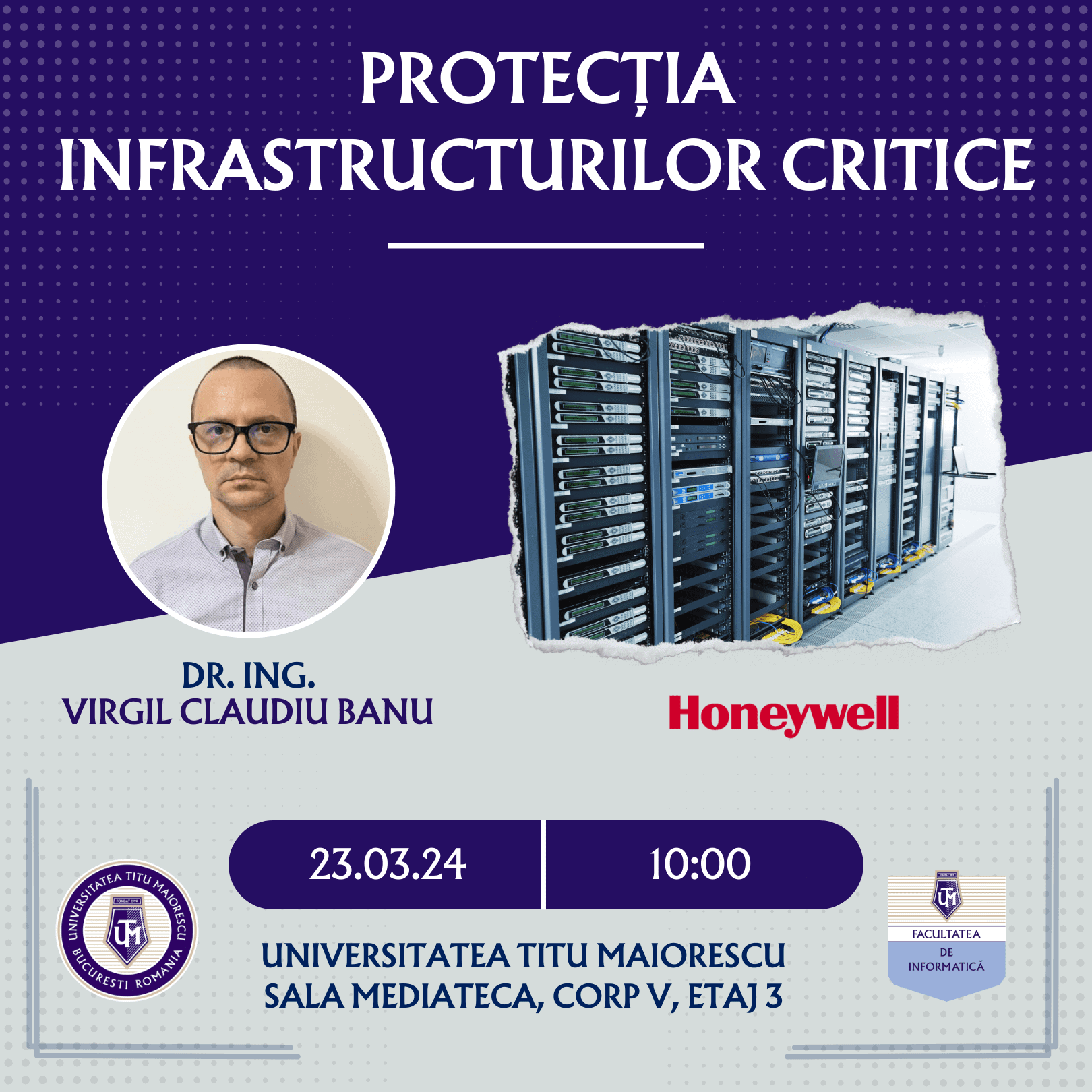 Facultatea de Informatică din cadrul Universității Titu Maiorescu vă invită sâmbată, 23 martie 2024, ora 10.00, Corp V, Etajul 3, Sala Mediatecă la cursul deschis – Protecția Infrastructurilor Critice.