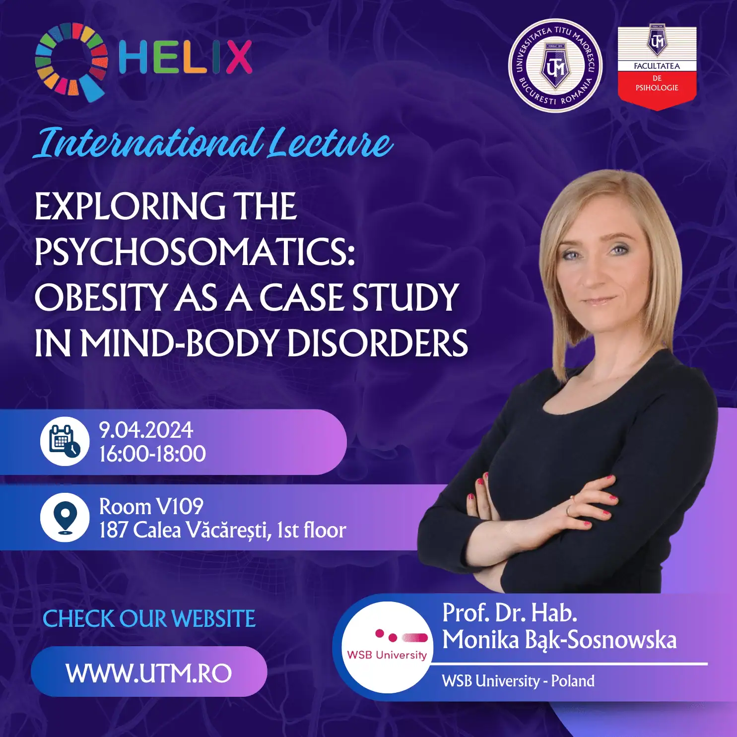 Invitatul nostru special este Prof. Dr. Hab Monika Bąk-Sosnowska, director al Centrului de Psihosomatică și Îngrijire Preventivă a Sănătății de la Universitatea WSB* din Polonia.
