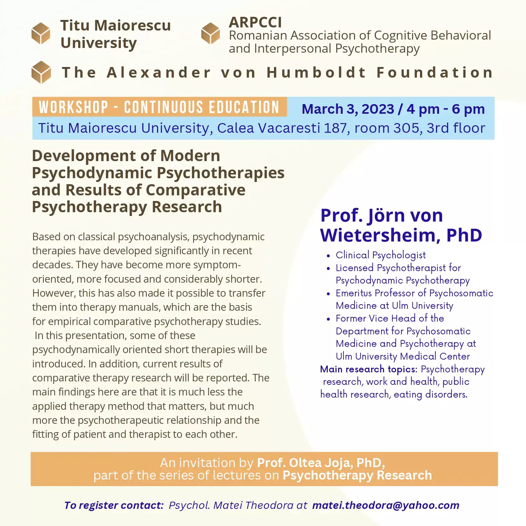 Facultatea de Psihologie a universității Titu Maiorescu în colaborare cu Asociația Română de Psihoterapie Cognitiv Comportamentală și Interpersonală organizează workshop-ul cu tema: „Development of Modern Psychodynamic Psychotherapies and Results of Comparative Psychotherapy Research”  susținut de Prof. Wietersheim (Germania).