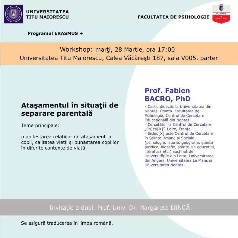 Marți, 28 Martie ora 17:00 va avea loc la Universitatea Titu Maiorescu din București, workshop-ul: Atașamentul în situații de separare parentală, în corpul V, sala V005, la parter.