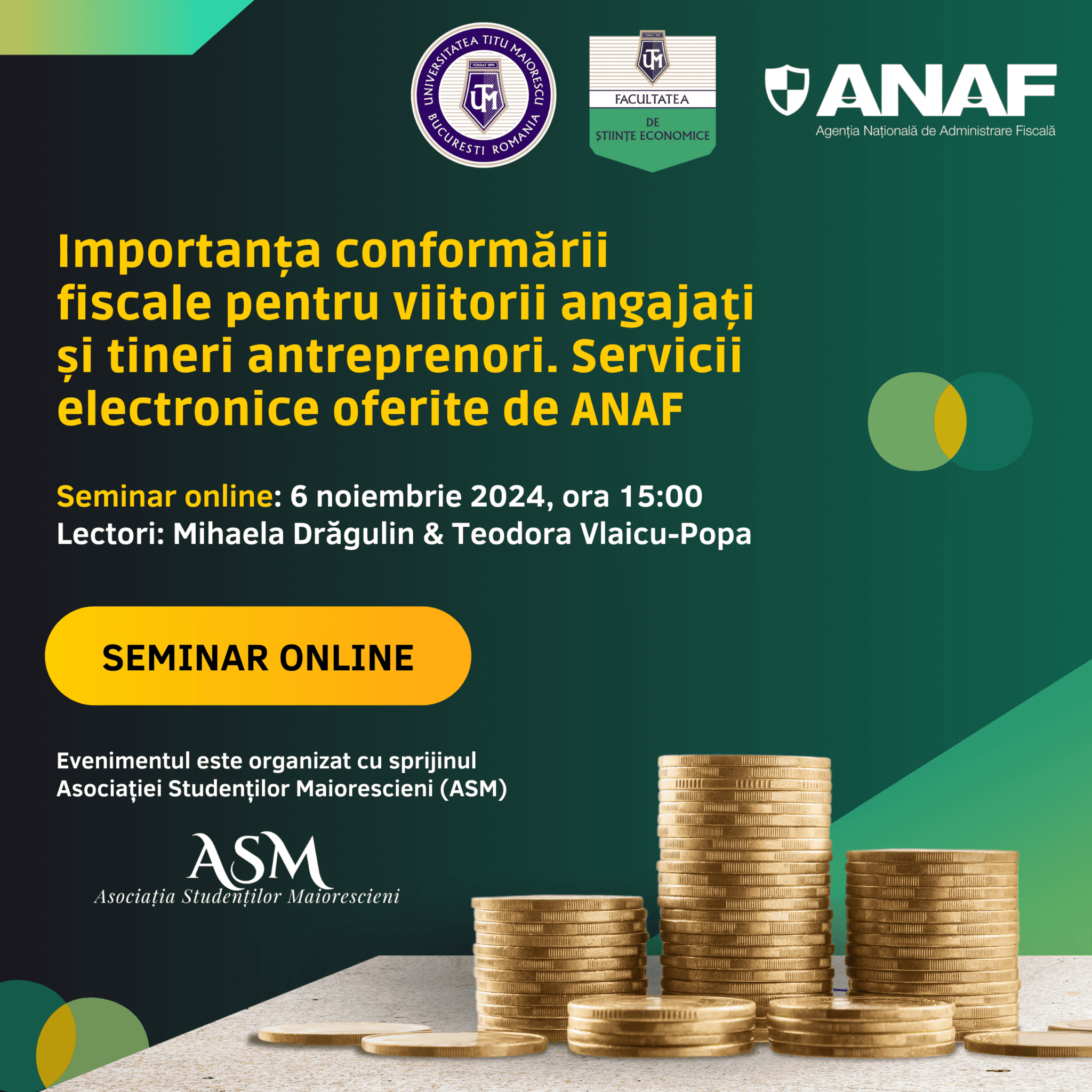 Facultatea de Științe Economice a Universității Titu Maiorescu, împreună cu Agenția Națională de Administrare Fiscală (ANAF) va invită în data de 6 noiembrie 2024, de la ora 15:00, la un seminar online în care se vor aborda subiecte legate de modul în care ANAF susține integrarea optimă a tinerilor pe piața muncii și a antreprenoriatului, precum și creșterea civismului fiscal. Vor fi prezentate serviciile electronice oferite de ANAF, prin intermediul cărora contribuabilii își pot îndeplini obligațiile fiscale.