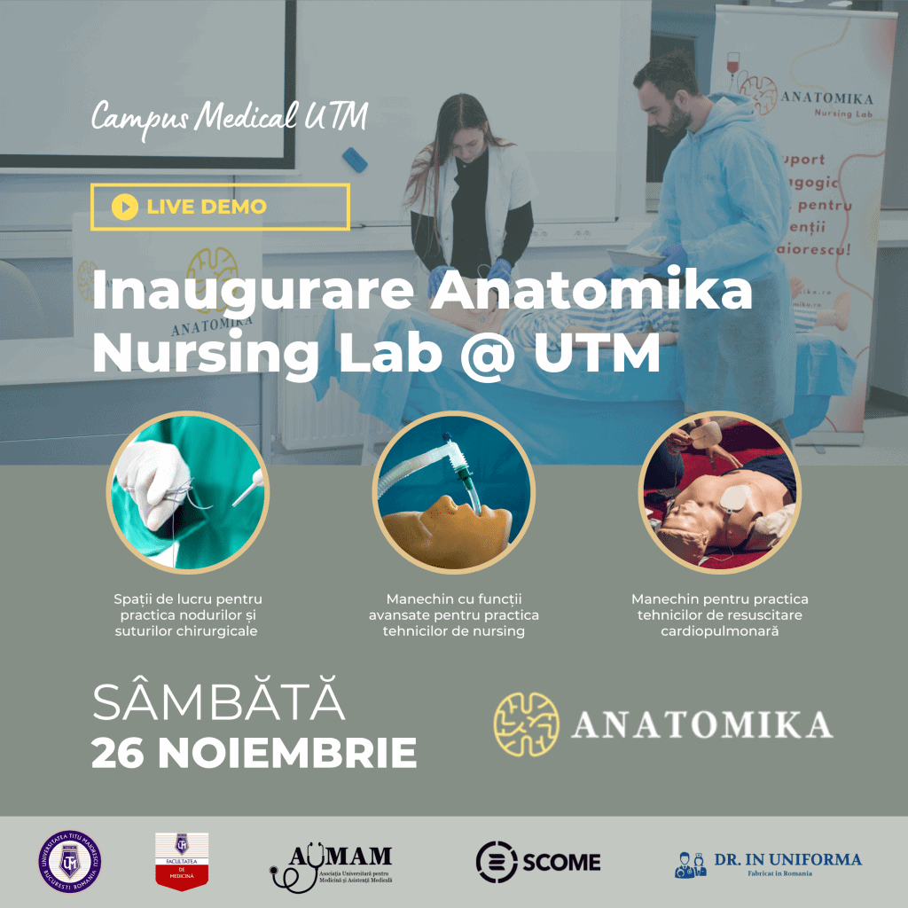 UTM și AUMAM invită studenții mediciniști să acceseze periodic pagina www.utm.ro și www.aumam.ro, pentru a consulta lista de ateliere și evenimente ce vor avea loc în Anatomika Nursing Lab.