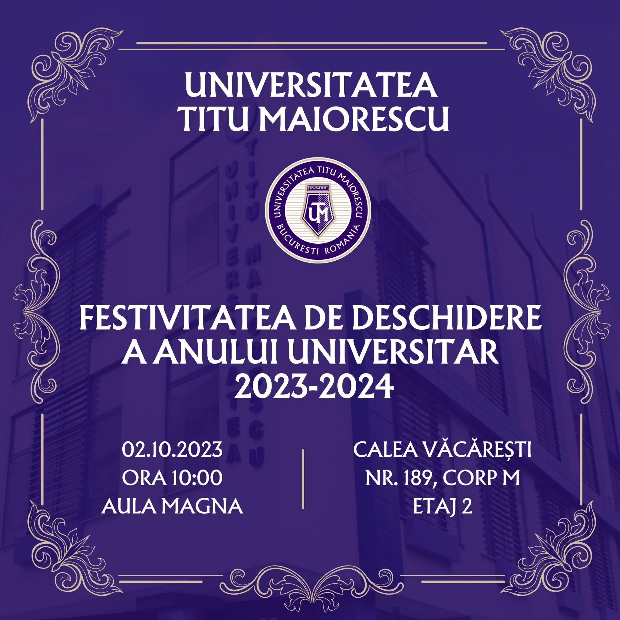 Universitatea Titu Maiorescu din București deschide porțile noului an universitar, 2023-2024, luni, 2 octombrie, începând cu ora 10.00, în Aula Magna (Calea Văcărești, nr. 189, Corp M, et. 2, sector 4).