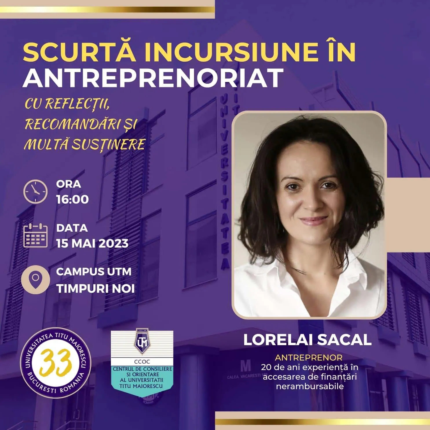 Evenimentul pe care vi-l propunem reprezintă o scurtă incursiune în antreprenoriat, cu povești reale de business și recomandări desprinse din experiența mediului de afaceri din România. Prezentarea va fi susținută de Lorelai Sacal, antreprenor, cu o experiență de 20 de ani în accesarea de finanțări nerambursabile, studentă la masterul de Psihologie Școlară și Consiliere Educațională.