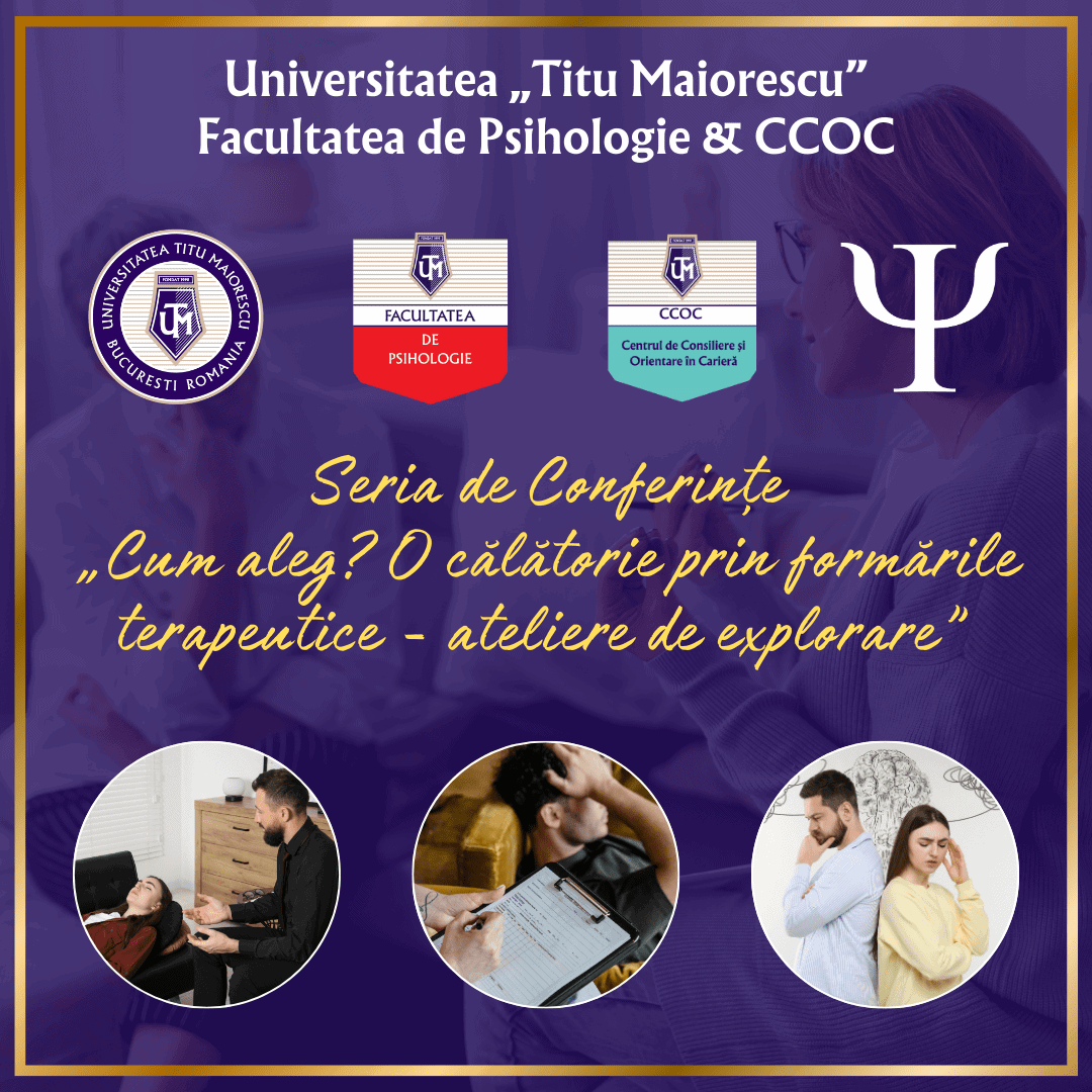 Facultatea de Psihologie din cadrul Universității „Titu Maiorescu” din București, în parteneriat cu Centrul de Consiliere și Orientare în Carieră (CCOC), organizează seria de conferințe și ateliere exploratorii „Cum aleg? O călătorie prin formările terapeutice – ateliere de explorare”, un proiect dedicat studenților care își doresc claritate și repere solide în alegerea direcției lor profesionale în domeniul psihoterapiei. Proiectul este inițiat și coordonat de studentele Ramona Manolache, Ileana Anca Baiciu și Bianca Baciu și își propune să creeze un cadru autentic de întâlnire între viitorii psihologi și formatori consacrați din principalele orientări terapeutice.
