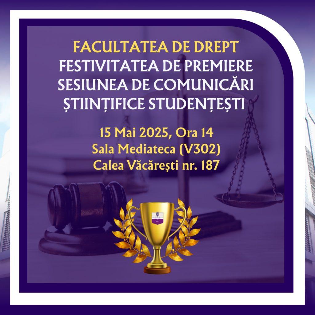 Facultatea de Drept vă invită joi, în data de 15 mai la orele 14 la Festivitatea de Premiere a Sesiunii de Comunicări Științifice Studențești. Evenimentul va avea loc în corpul V, din Calea Văcărești 187, sala Mediatecă situată la etajul 3 (V302).