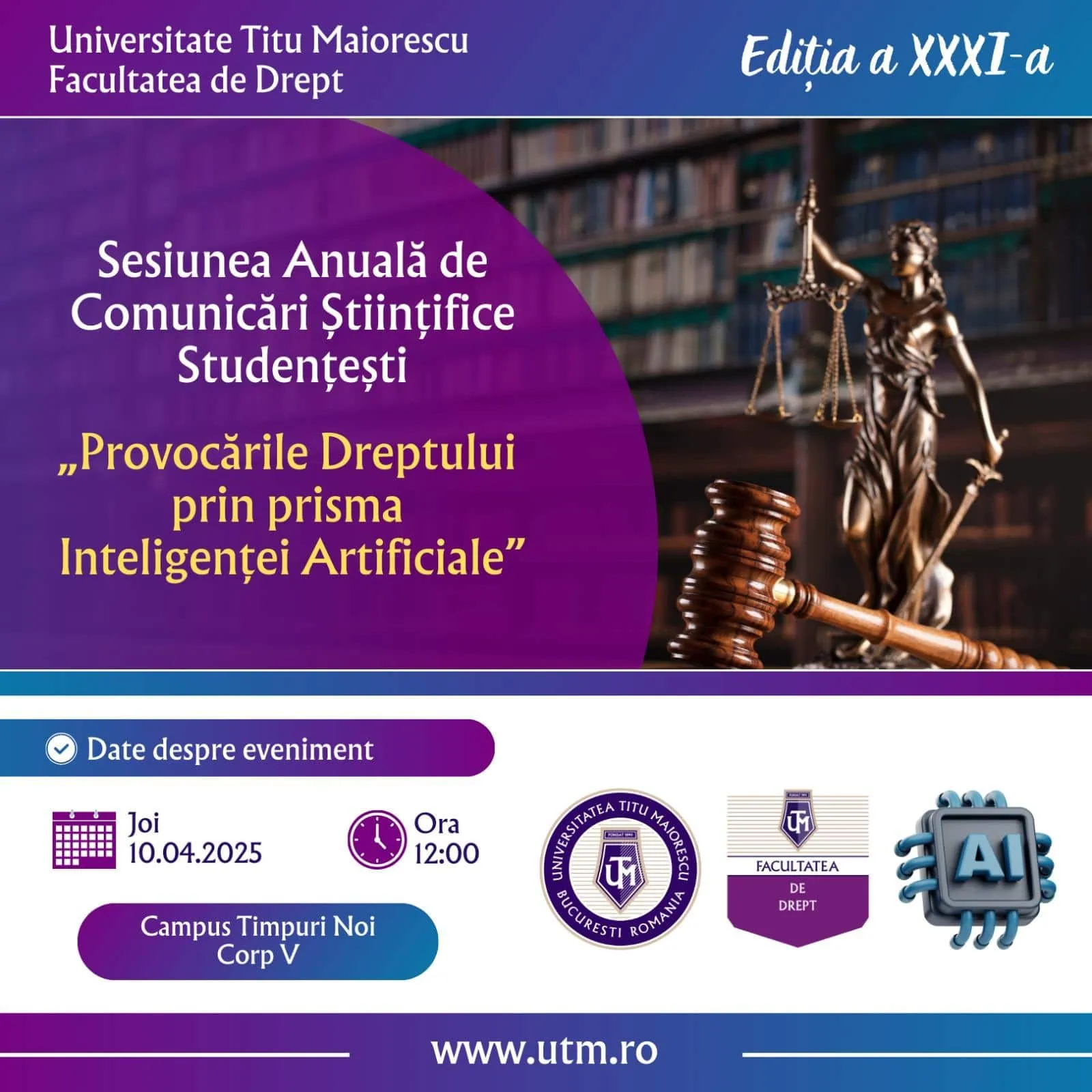 Sesiunea Anuală de Comunicări Științifice Studențești ediția a XXXI-a , cu tema: Provocările Dreptului prin prisma Inteligenței Artificiale, se va desfășura la sediul Facultății de Drept -Universitatea Titu Maiorescu, din Calea Văcărești nr.187, sector 4, București.