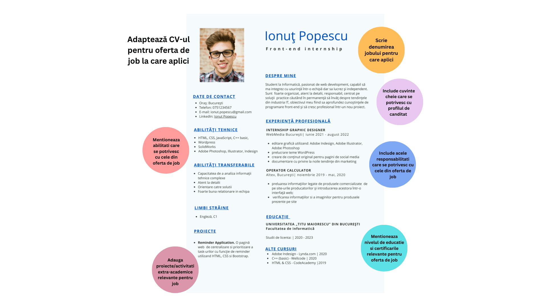 • Date de contact: oraș, telefon, e-mail, LinkedIn, GitHub (pentru IT) sau alte website-uri relevante