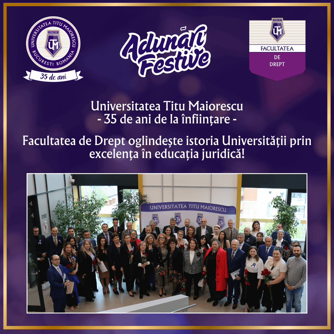Adunarea Generală Festivă organizată de Facultatea de Drept cu ocazia manifestărilor dedicate UTM35 a avut loc în data de 15 aprilie 2025. Facultatea de Drept celebrează 35 de ani de la înființare și se remarcă prin excelența dovedită în educația juridică.