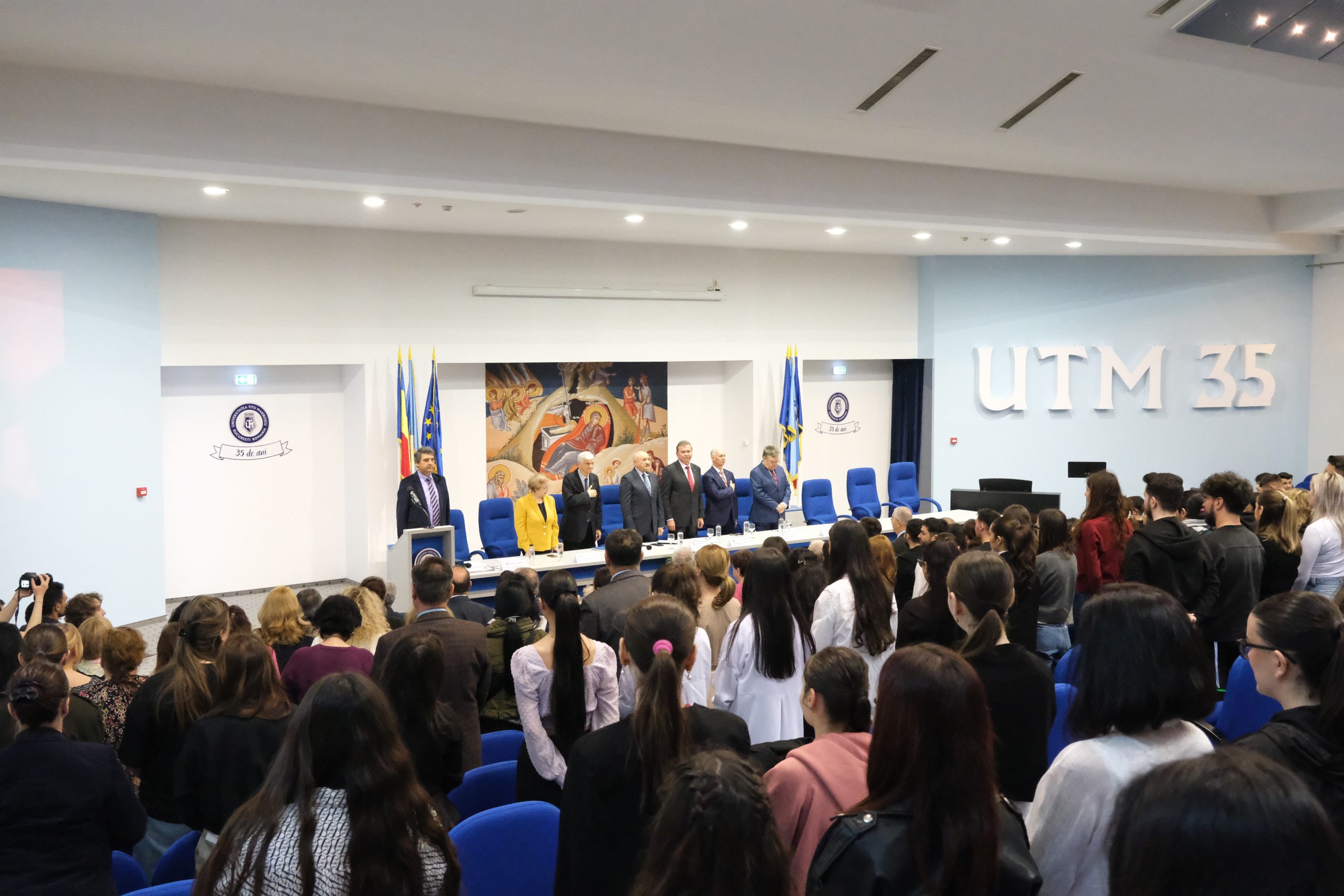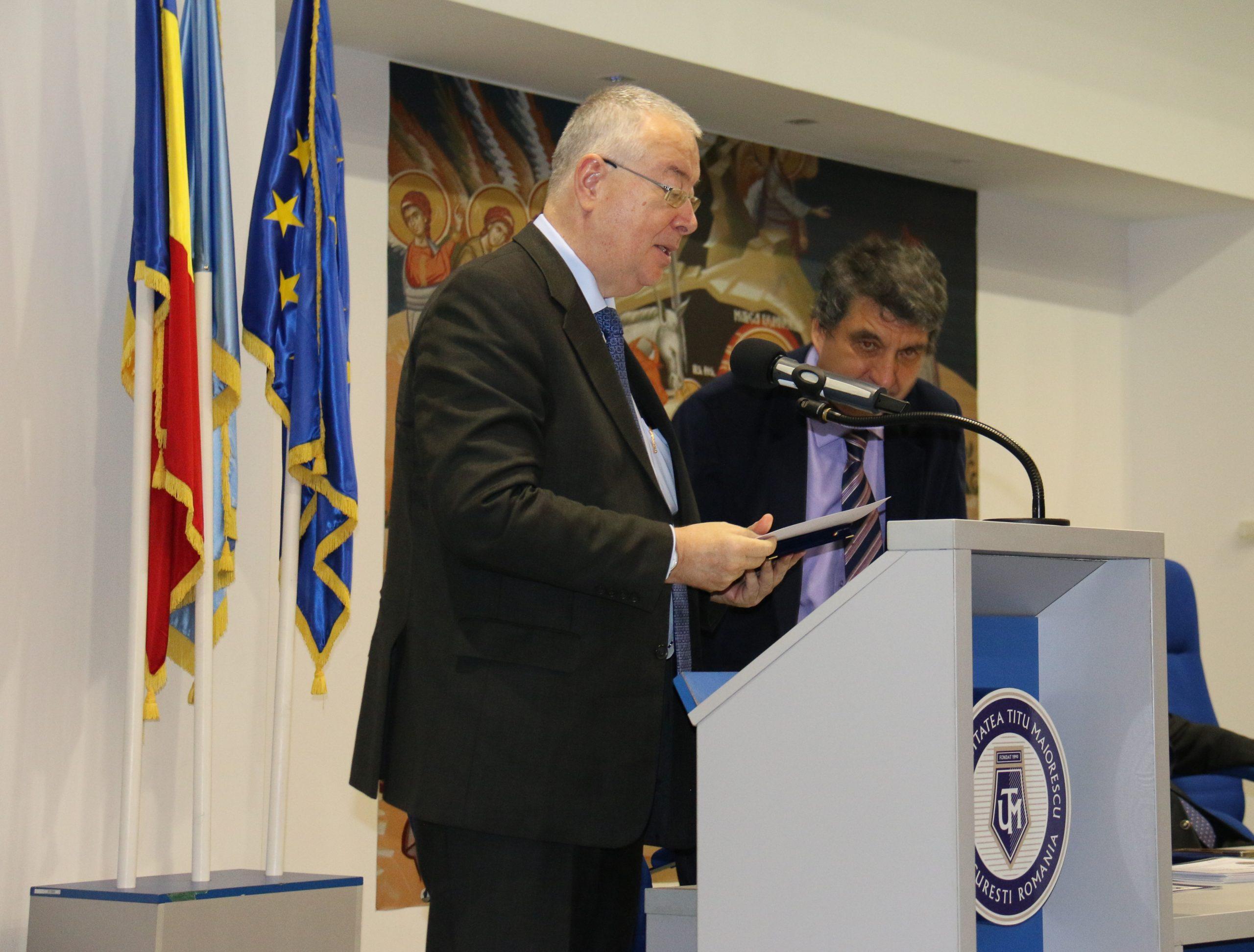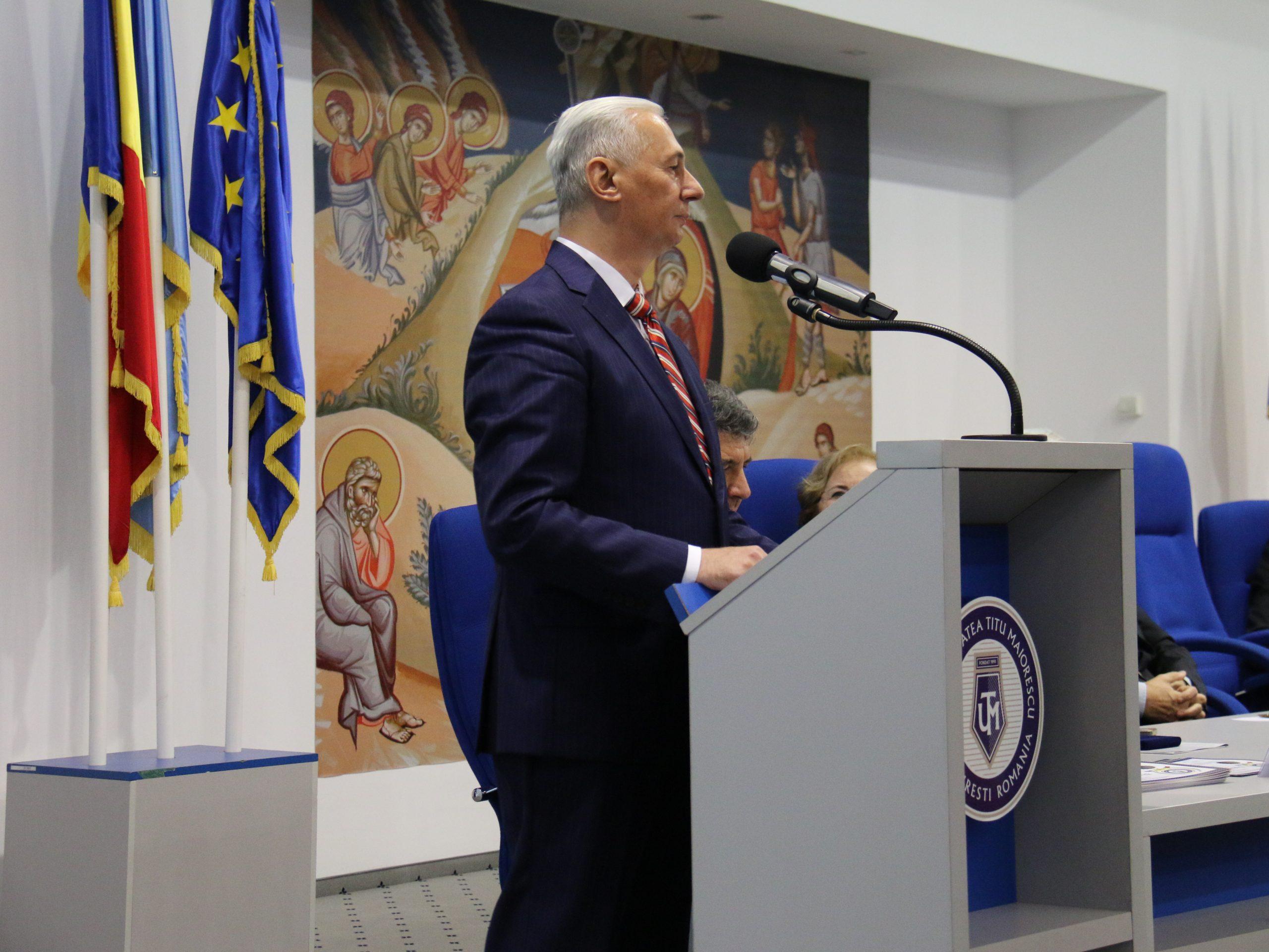 Președintele Prof. univ. dr. Iosif Urs a vorbit despre Titu Maiorescu, spiritul maiorescian și importanța legatului spiritual și moral al mentorului Universității pentru dezvoltarea acesteia și pentru evoluția învățământului superior românesc în ansamblu. Rectorul Prof. univ. dr. Daniel Cochior a realizat portretul instituțional al Universității la împlinirea a 35 de ani, a reliefat statutul acesteia de Universitate de elită, certificat de prezența ei constantă în Metaranking-urile naționale, care ierarhizează cele mai bune universități românești. În același cadru, s-a referit la Facultatea de Științele Educației, Comunicare și Relații Internaționale, apreciind evoluția și perspectivele de dezvoltare ale acesteia. Au susținut alocuțiuni: Prof. univ. dr. ing. Iustin Priescu, Președintele Senatului, privitor la rolul capital al implicării tehnologiei digitale în activitatea UTM, Prof. univ. dr. Smaranda Angheni și Prof. univ. dr. Valentin Pau, Vicepreședinți, referitor la fondarea și evoluția Universității, Prof. univ. dr. Titi Paraschiv, Prorector, pe tema importanței cercetării științifice ca factor de dezvoltare și situare a Universității în spațiul academic românesc și internațional. Din cadrul Facultății, au mai luat cuvântul Prof. univ. dr. Teodor Frunzeti, directorul Departamentului Relații Internaționale și Studii Europene, și Prof. univ. dr. Puiu Mihai, Departamentul de Specialitate cu Profil Psihopedagogic, precum și reprezentanții studenților și ai cursanților din Programului Pregătitor de Limba Română pentru Cetățeni Străini, care au vorbit despre calitatea studiilor în Universitatea Titu Maiorescu și perspectivele deschise de acestea.