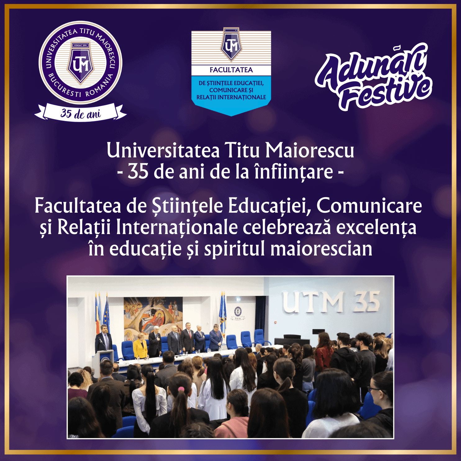 În data de 2 Aprilie 2025, cu prilejul împlinirii a 35 de existență a Universității Titu Maiorescu din București, s-a desfășurat Adunarea Generală Festivă a Facultății de Științele Educației, Comunicare și Relații Internaționale. Evenimentul, care a deschis seria manifestărilor dedicate aniversării a 35 de ani în Universitate, a avut loc în Aula Magna, începând cu ora 12.00, în prezența unui public impresionant, format din cadre didactice și de cercetare, studenți, masteranzi și elevi de liceu, fiind onorat și de participarea unor invitați speciali. La prezidiu s-au aflat: Prof. univ. dr. Iosif Urs, Președintele Universității, Prof. univ. dr. Daniel Cochior, Rectorul Universității, Prof. univ. dr. ing. Iustin Priescu, Președintele Senatului, Prof. univ. dr. Smaranda Angheni, Vicepreședinte, Prof. univ. dr. Valentin Pau, Vicepreședinte, Prof. univ. dr. Titi Paraschiv, Prorector, Prof. univ. dr. Sorin Ivan, Decanul Facultății de Științele Educației, Comunicare și Relații Internaționale.