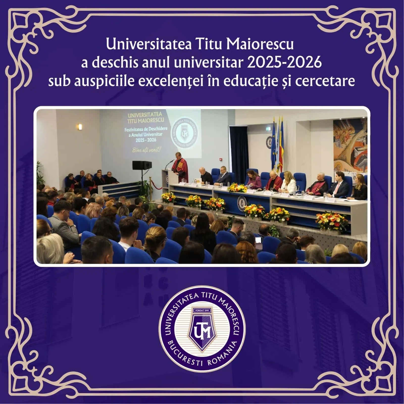 Festivitatea de Deschidere a anului universitar a constituit cadrul de manifestare a bucuriei în fața unui nou început și de bun-venit pentru toți studenții, un elogiu adus educației prin luări de cuvânt, idei și forme artistice de manifestare a creativității și, în același timp, un prilej solemn de reasumare de către Universitatea Titu Maiorescu a angajamentului ei pentru educație academică și cercetare științifică sub semnul excelenței, performanței și competitivității.