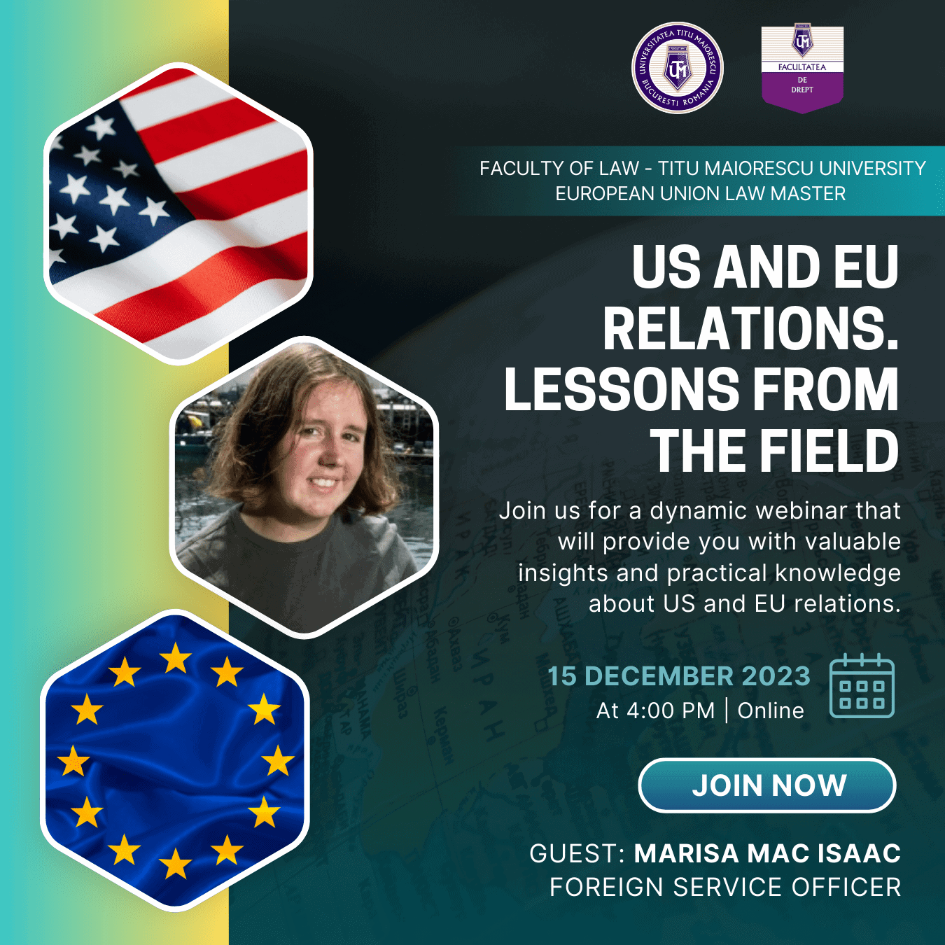 La Universitatea Titu Maiorescu, continuăm tradiția cursurilor cu invitați de excepție de la programele de studiu din cadrul Facultății de Drept. La cursul de Drept Constituțional al Uniunii Europene de la programul de master – Dreptul Uniunii Europene, secțiunea Relații Externe ale Uniunii Europene, din data de 15 decembrie 2023 de la ora 16, în format online, studenții vor avea oportunitatea de a învăța noțiuni noi de la o invitată specială, Marisa Mac Issac. Doamna profesor Mac Issac, este un specialist în domeniul Relațiilor Externe, ce va prezenta studenților maiorescieni o perspectivă aplicată asupra relațiilor externe între Statele Unite ale Americii și Uniunea Europeană.