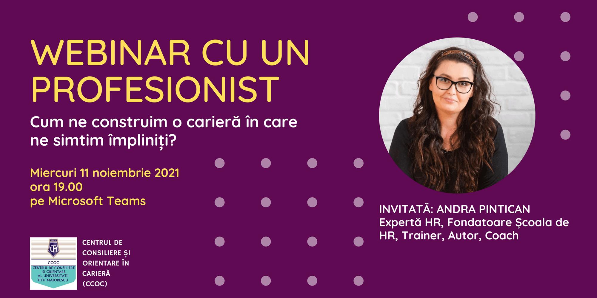 Seria de întâlniri Webinar cu un Profesionist urmărește să ofere studenților accesul la informații și resurse relevante pentru carieră, oportunitatea de extindere a rețelei de contacte cu profesioniști din domeniile lor de interes, răspunsuri la întrebări care să aducă mai multă claritate în alegerea traseului de carieră, o mai bună înțelegere a provocarilor profesionale și a mecanismelor de depășire a blocajelor apărute în dezvoltarea unei vieți profesionale împlinite. Informatii și resurse suplimentare pot fi accesate pe website-ul CCOC: https://www.utm.ro/centrul-de-consiliere-si-orientare-in-cariera/
