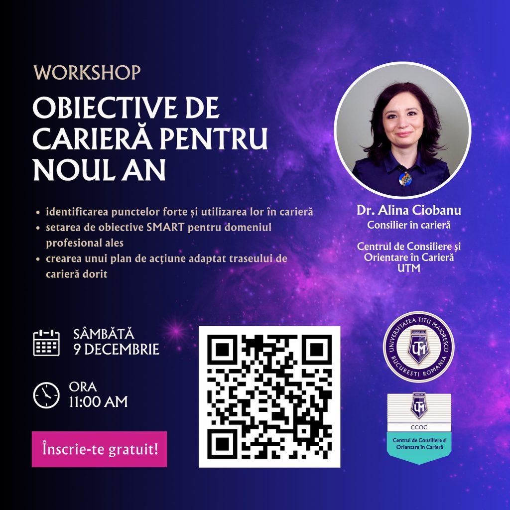 În data de 9 decembrie, începând cu ora 11.00, Centrul de Consiliere și Orientare în Carieră te invită la un workshop sustinut de Dr. Alina Ciobanu, consilier în carieră,  în care vei explora aspecte esențiale ale construirii și atingerii obiectivelor profesionale într-un mod practic și eficient.