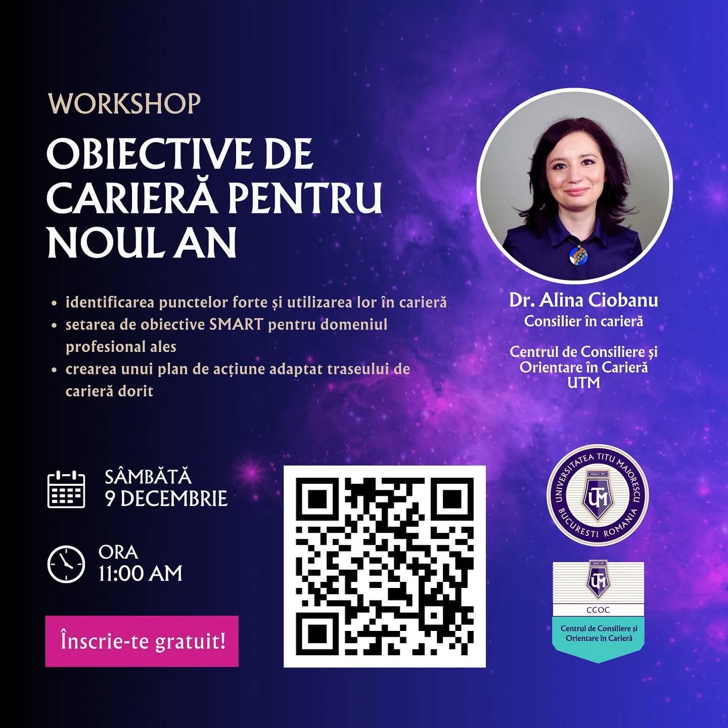 În data de 9 decembrie, începând cu ora 11.00, Centrul de Consiliere și Orientare în Carieră te invită la un workshop sustinut de Dr. Alina Ciobanu, consilier în carieră,  în care vei explora aspecte esențiale ale construirii și atingerii obiectivelor profesionale într-un mod practic și eficient.