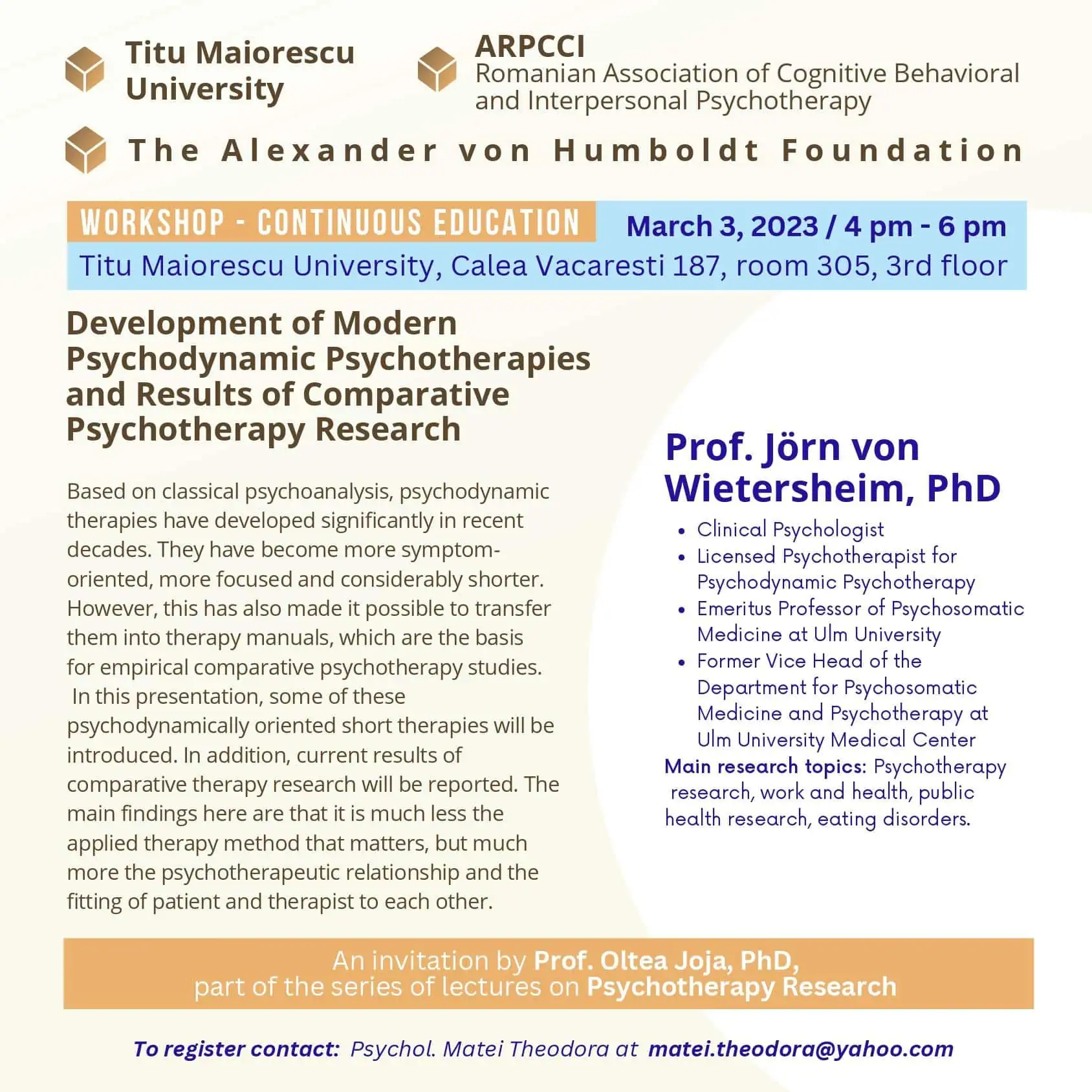 Facultatea de Psihologie a universității Titu Maiorescu în colaborare cu Asociația Română de Psihoterapie Cognitiv Comportamentală și Interpersonală organizează workshop-ul cu tema: „Development of Modern Psychodynamic Psychotherapies and Results of Comparative Psychotherapy Research”  susținut de Prof. Wietersheim (Germania).